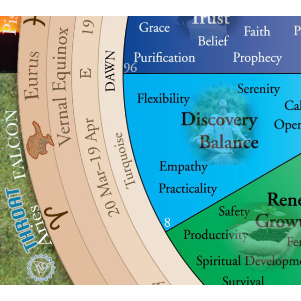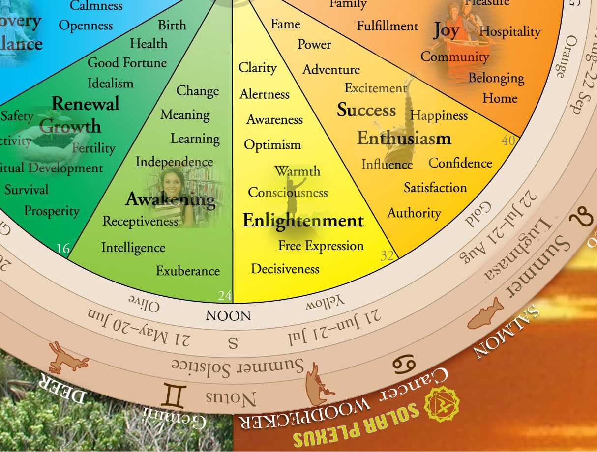 Your guide to the cycles of colors and their meanings, the cycles of the day, the cycles of the seasons, the solstices, and equinoxes,, your spirit totems, your astrological sign, your natural birthstone colors, your chakra energy centers, and the element that guides your birth and life.