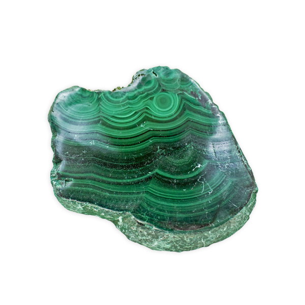 Description: Malachite Slice. This stone does contain natural cracks and fractures. The name Malachite may come from the Greek word malakee or malache, signifying the resemblance of Mallow leaves, or from the Greek word malakos, meaning soft. Being a carbonate of copper, Malachite is sometimes intergrown with Azurite, forming Malachite-Azurite, or with Chrysocolla, forming Malachite-Chrysocolla.