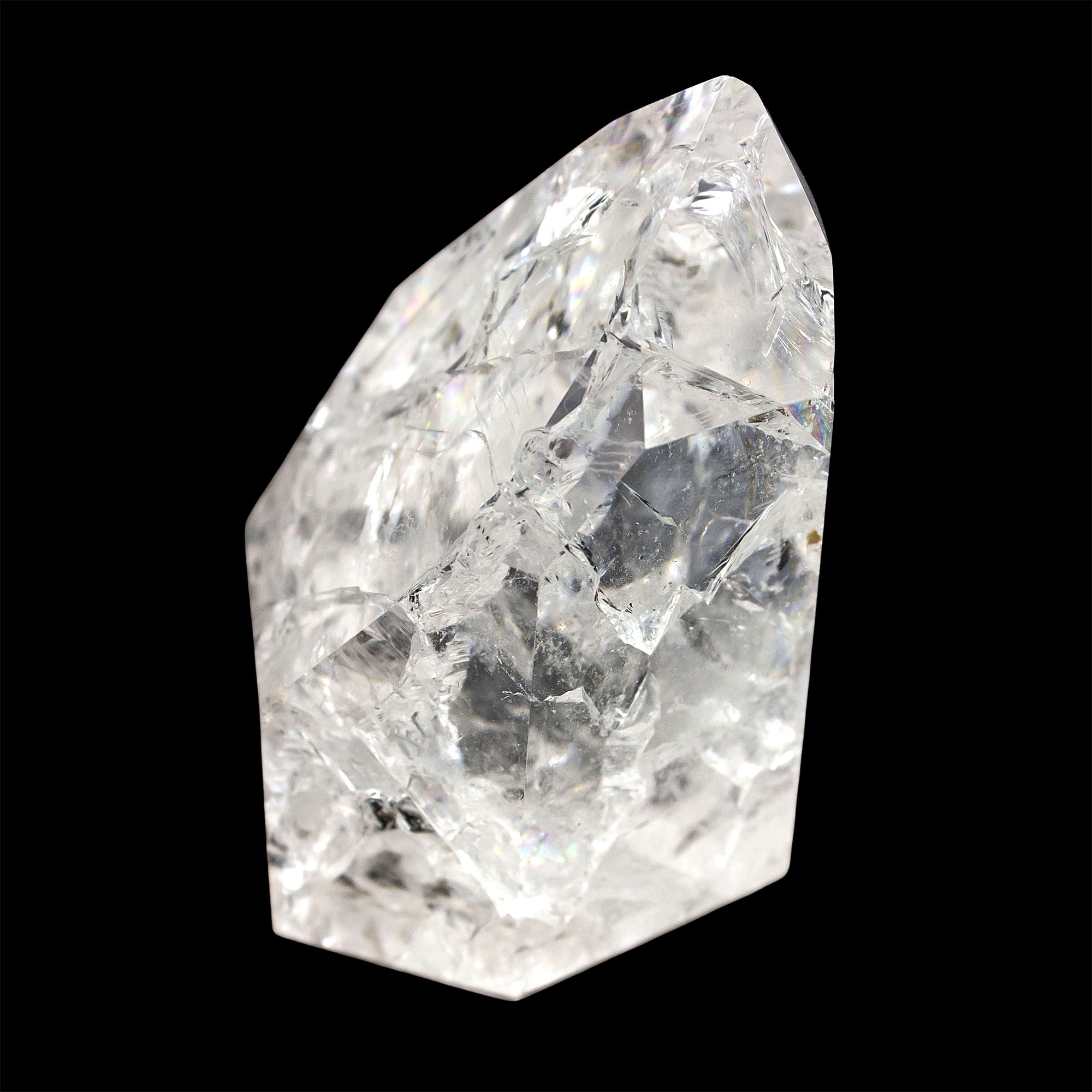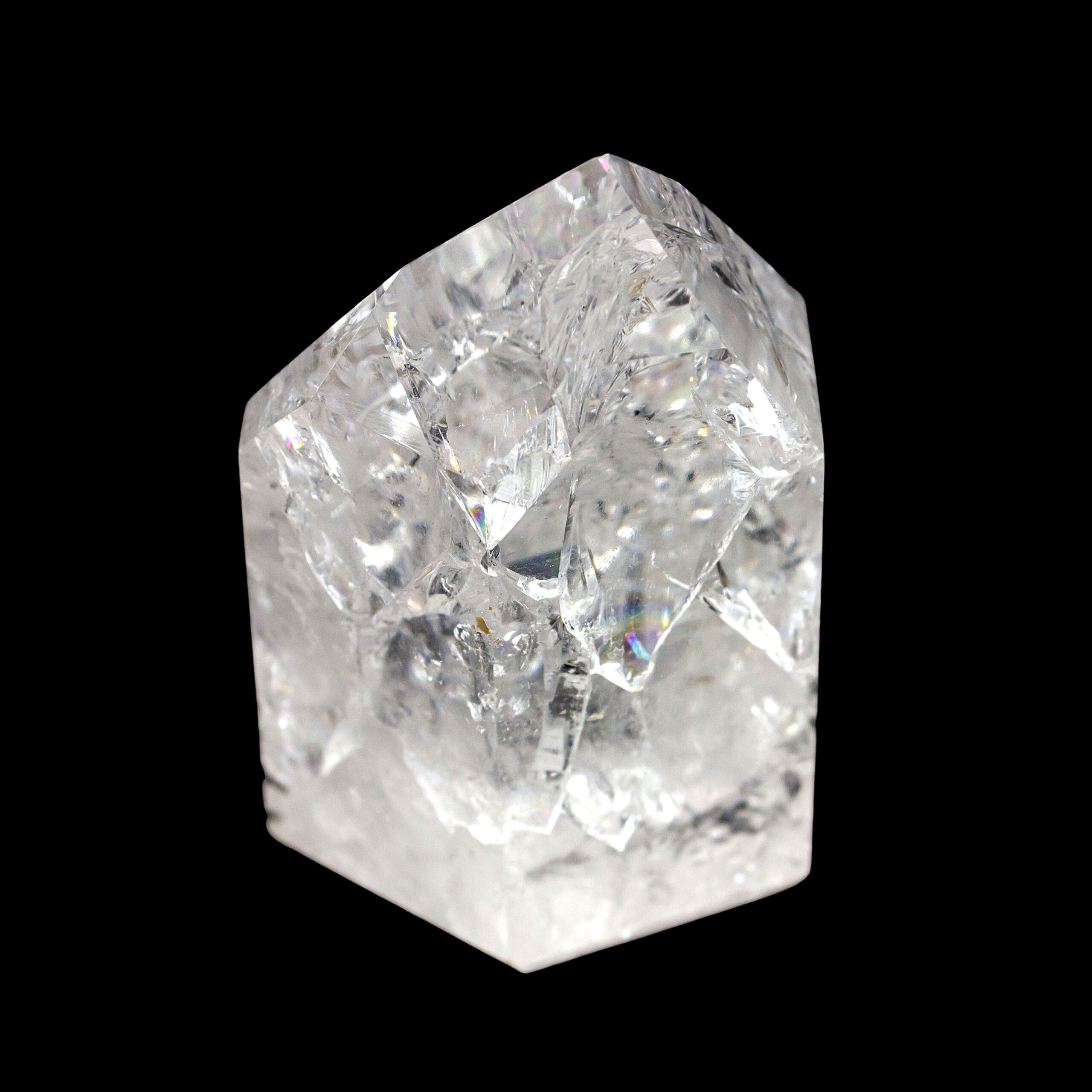 DESCRIPTION: Fire and Ice Devic Temple Crystal, also known as Crackle Quartz. These crystals are named due to the process used to “crackle” the quartz. The quartz is heated to very high temperatures and then quickly cooled with cold water, which provides the crackling effect. These crystals have inclusions such as fairy frost and other areas, which provide a resting place for Light Beings. Devic Temple Crystals are considered by some to be Master Crystals.
