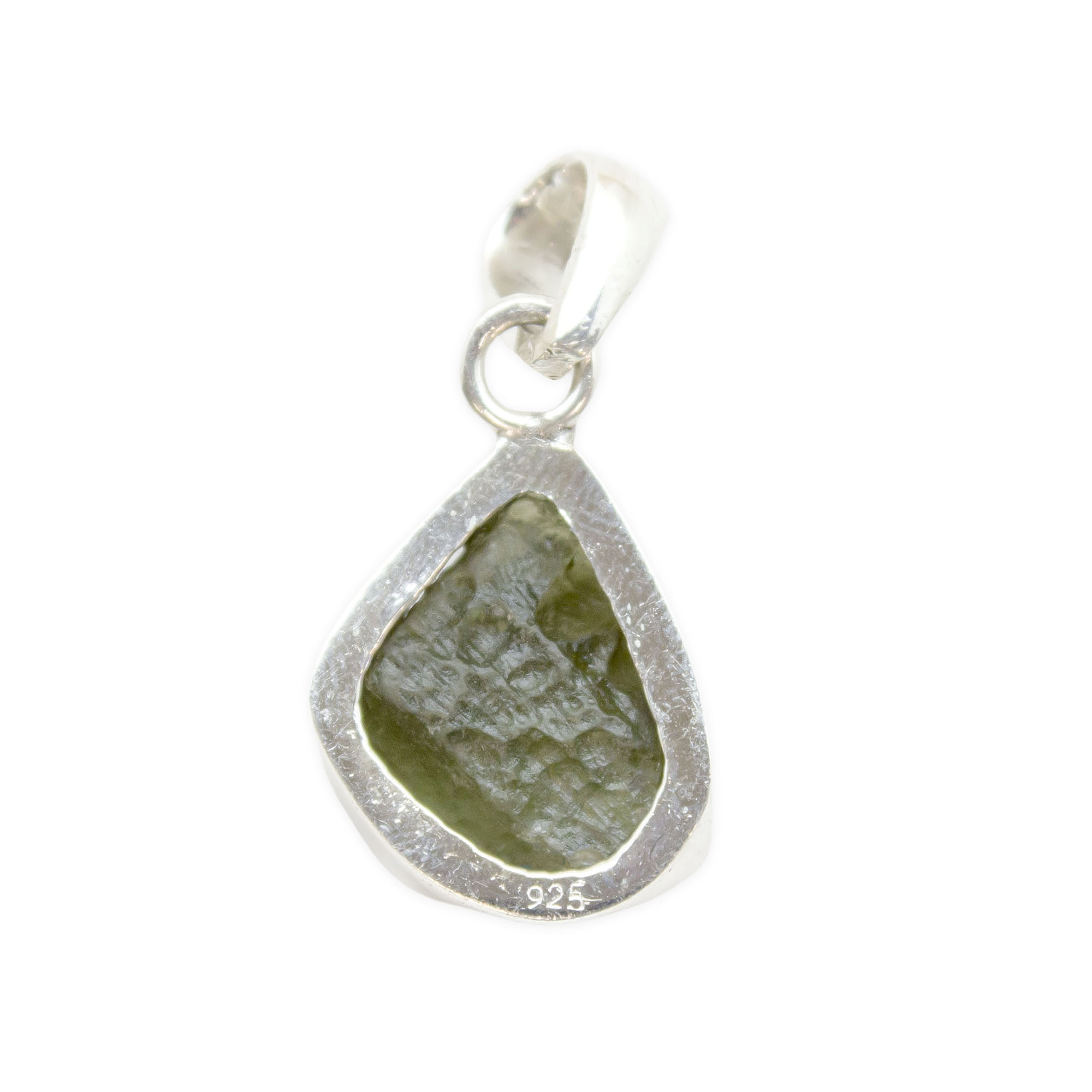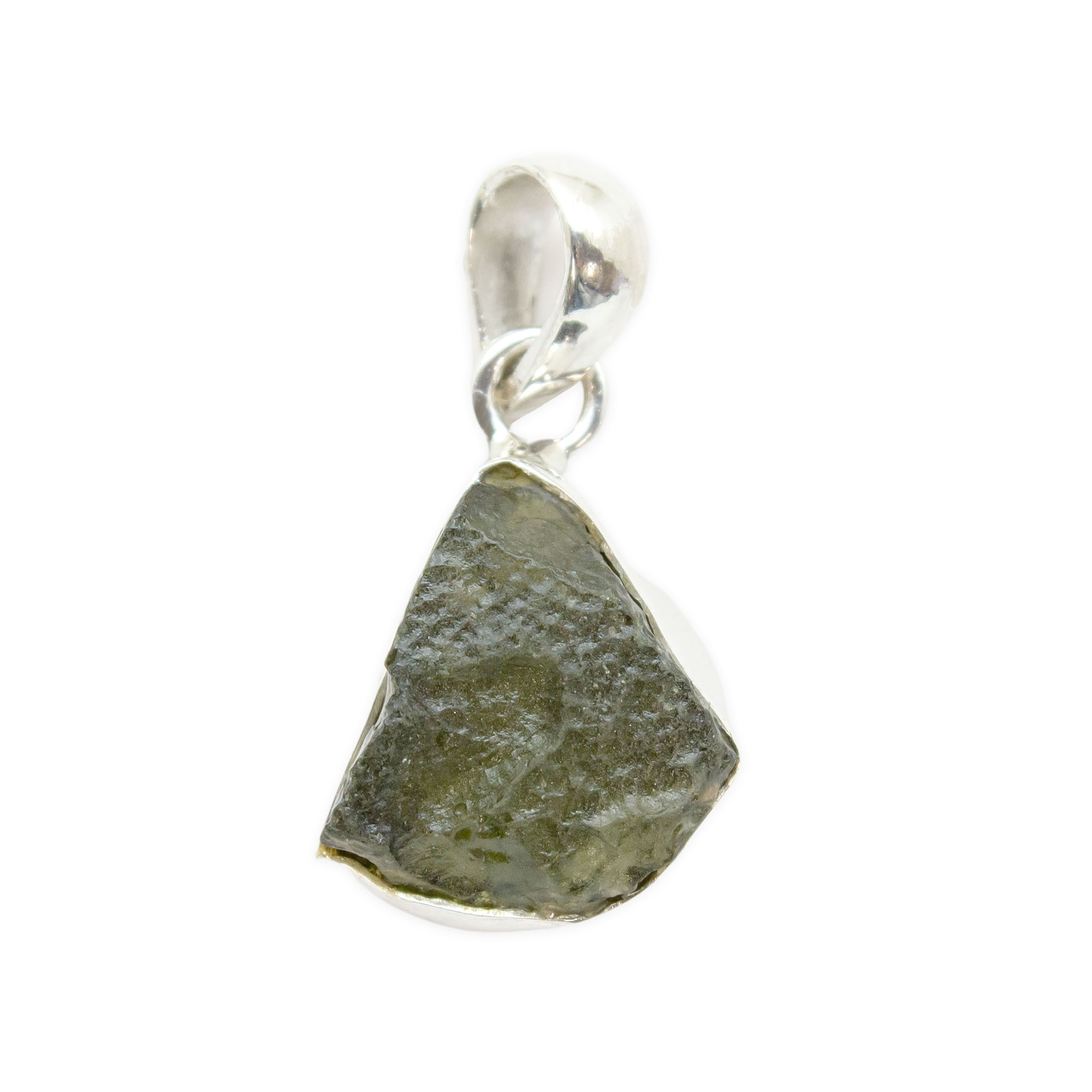Description: Sterling Silver Moldavite Pendant. Moldavite is a type of tektite, which is a natural glass that forms when a meteorite impacts the Earth’s surface. It is characterized by its unique green color, often described as a translucent or olive-green shade. It has a distinct, rough texture with natural ridges and indentations.