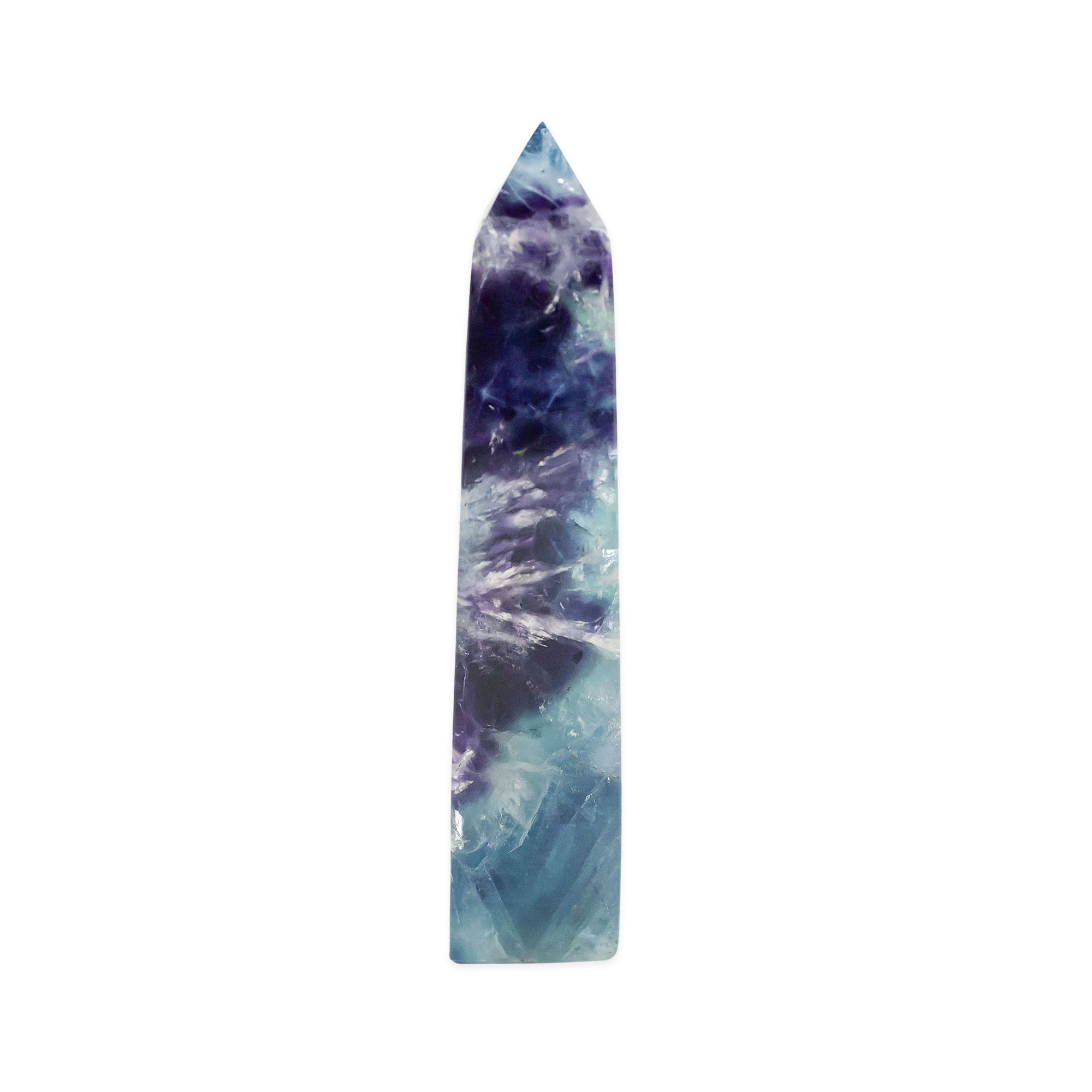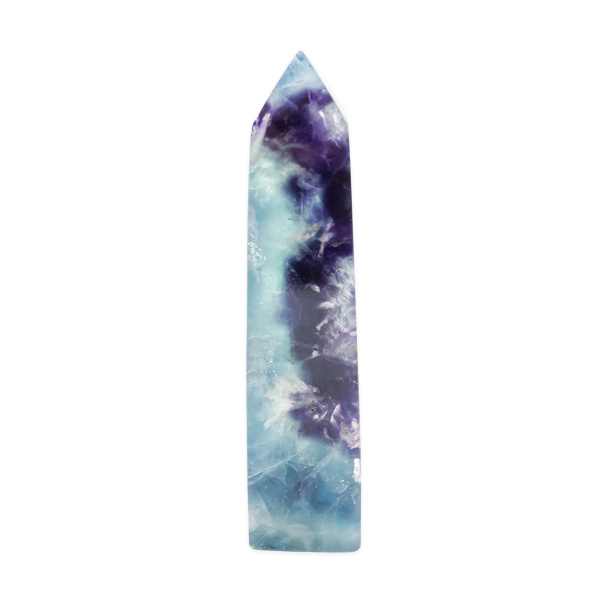 Description: Feather Fluorite Point. Feather Fluorite is a variety of Fluorite, forms in a wide variety of hues, typically purple, green, yellow, blue, and pure form – colorless. It is composed of calcium fluoride and is a member of the Halide family.