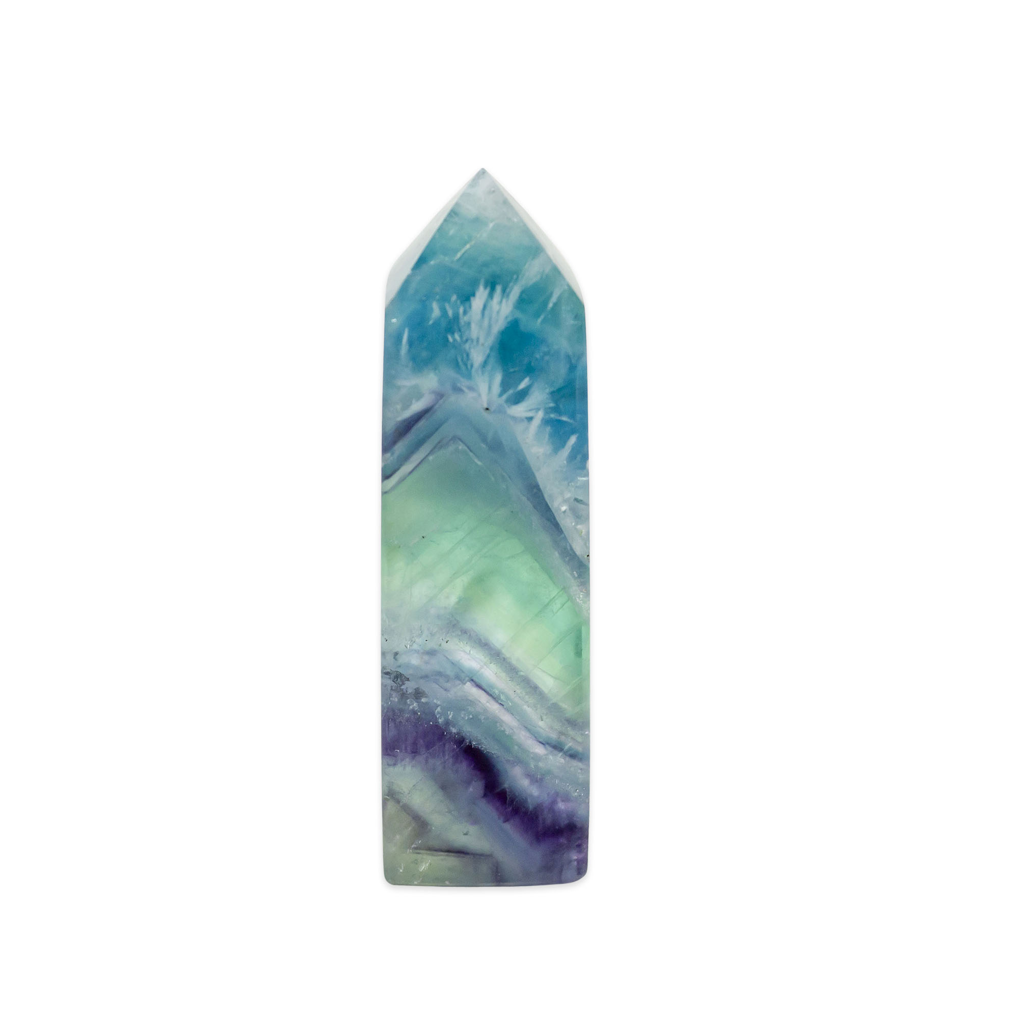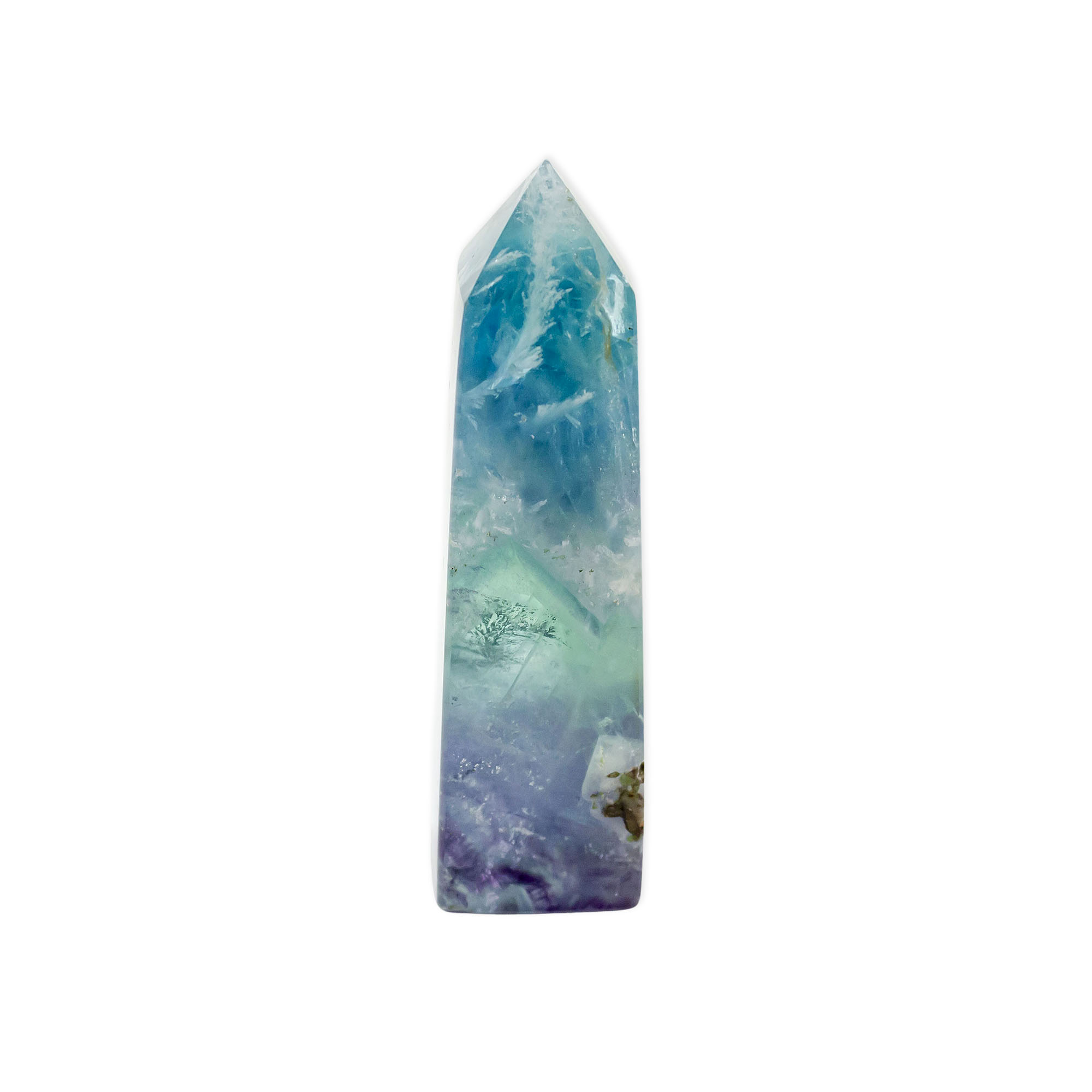 Description: Feather Fluorite Point. Feather Fluorite is a variety of Fluorite, forms in a wide variety of hues, typically purple, green, yellow, blue, and pure form – colorless. It is composed of calcium fluoride and is a member of the Halide family.