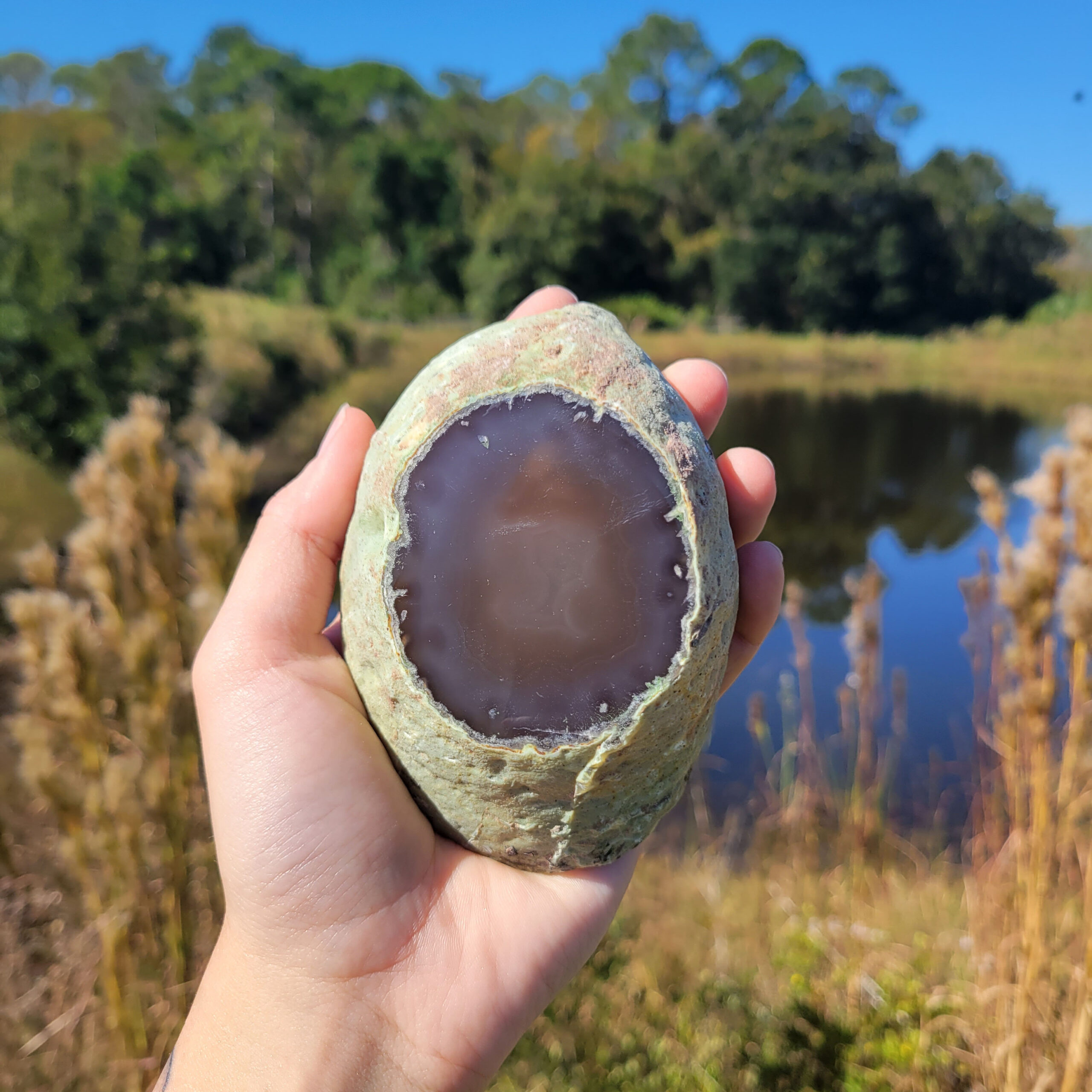 Description: Natural Enhydro Agate. This stone is pure, undyed, and full of vibrant energy. An Enhydro is a crystal that contains drops of water or other liquids suspended in enclosed small bubbles. This piece contains a moving water bubble. In the photos, you’ll see one with an orange circle. This is where you will see the Enhydro.