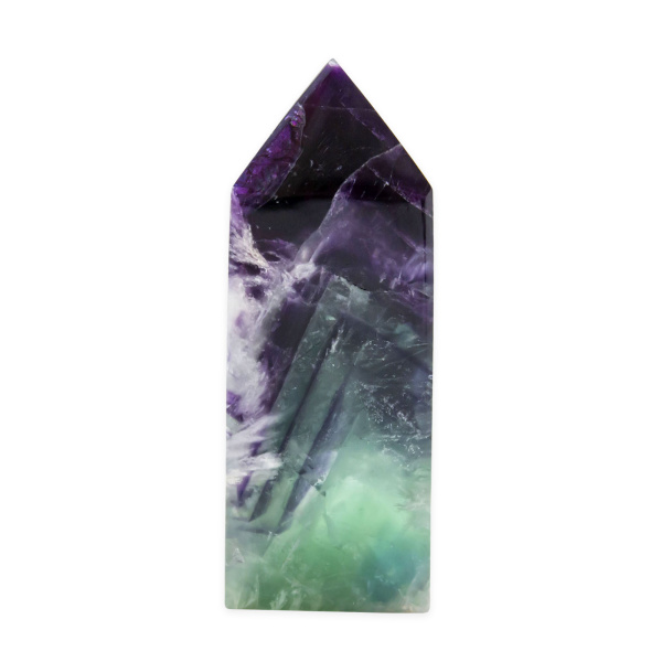 Description: Feather Fluorite Point. Feather Fluorite is a variety of Fluorite, forms in a wide variety of hues, typically purple, green, yellow, blue, and pure form – colorless. It is composed of calcium fluoride and is a member of the Halide family.