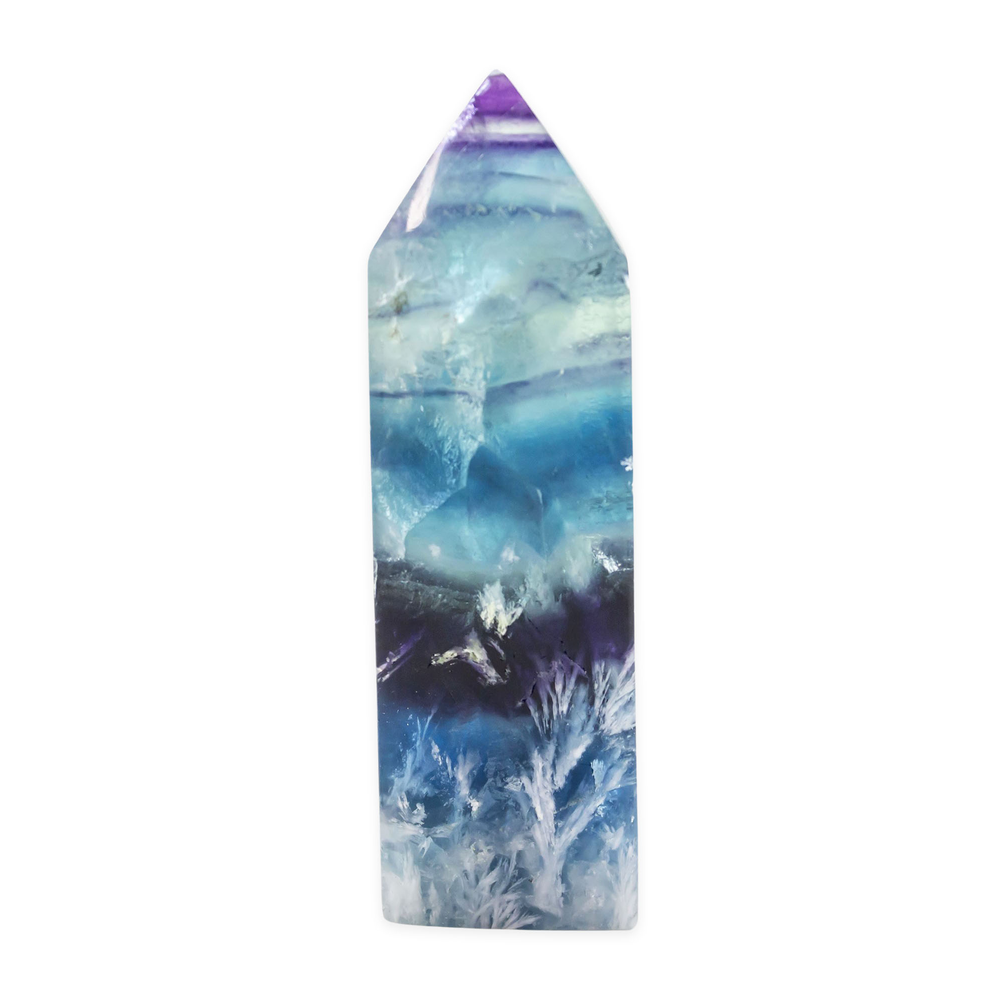 Description: Feather Fluorite Point. Feather Fluorite is a variety of Fluorite, forms in a wide variety of hues, typically purple, green, yellow, blue, and pure form – colorless. It is composed of calcium fluoride and is a member of the Halide family.