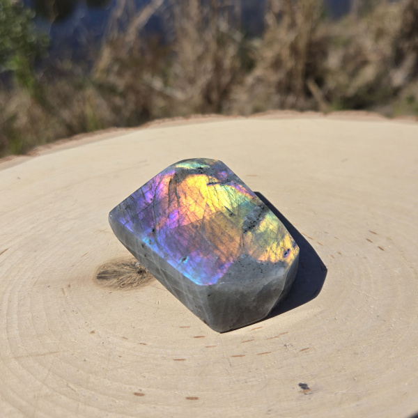 Description Sunset Labradorite Freeform. Labradorite is a member of the Feldspar family and is treasured for its remarkable play of color, known as labradorescence. The stone, usually gray-green, dark gray, black, or grayish-white, is composed of aggregate layers that refract light as iridescent flashes of peacock blue, gold, pale green, or coppery red.