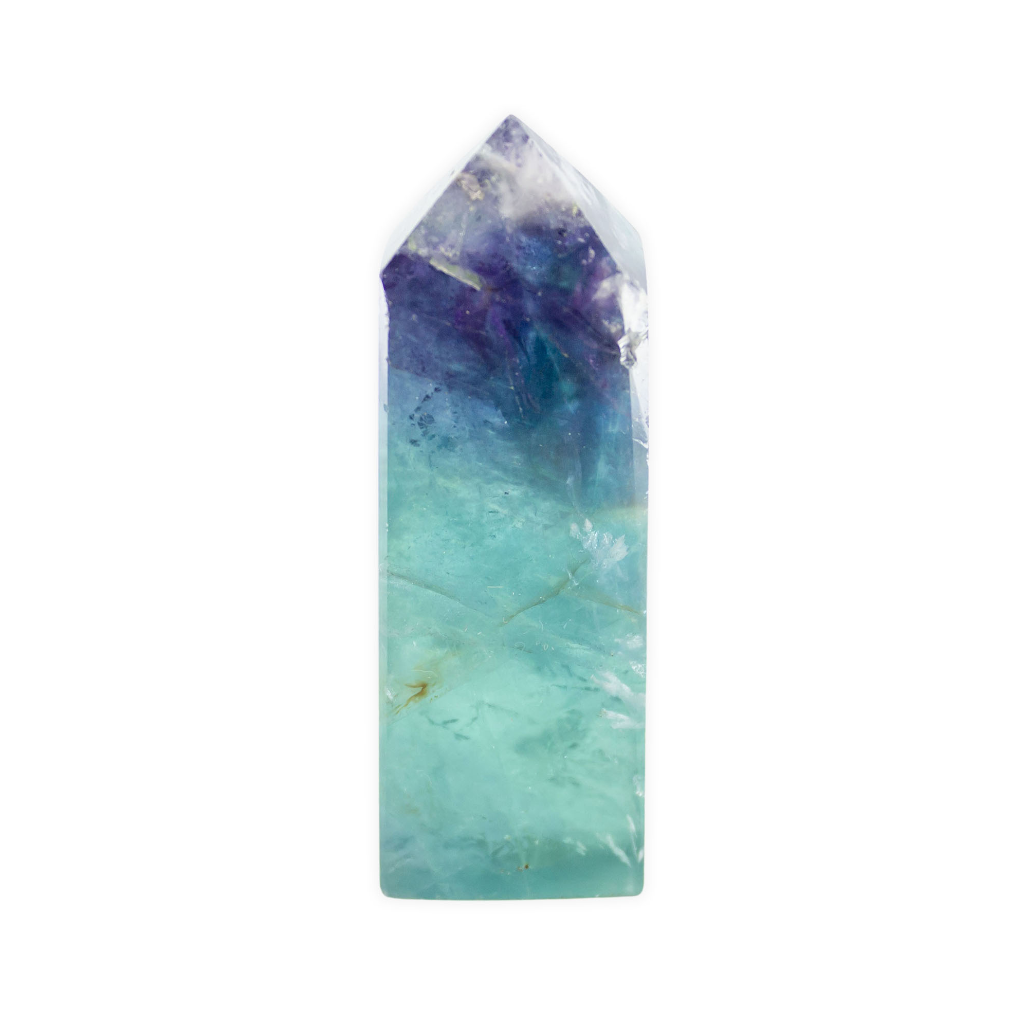 Description: Feather Fluorite Point. Feather Fluorite is a variety of Fluorite, forms in a wide variety of hues, typically purple, green, yellow, blue, and pure form – colorless. It is composed of calcium fluoride and is a member of the Halide family.