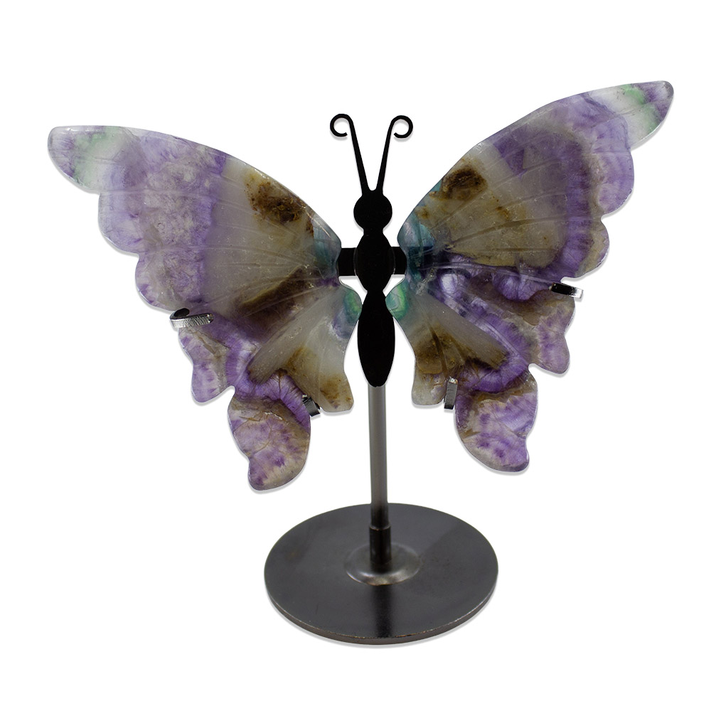 Description: Stunning Fluorite Butterfly on Stand. Fluorite forms in a wide variety of hues, typically purple, green, yellow, blue, and pure form – colorless. It is composed of calcium fluoride and is a member of the Halide family.