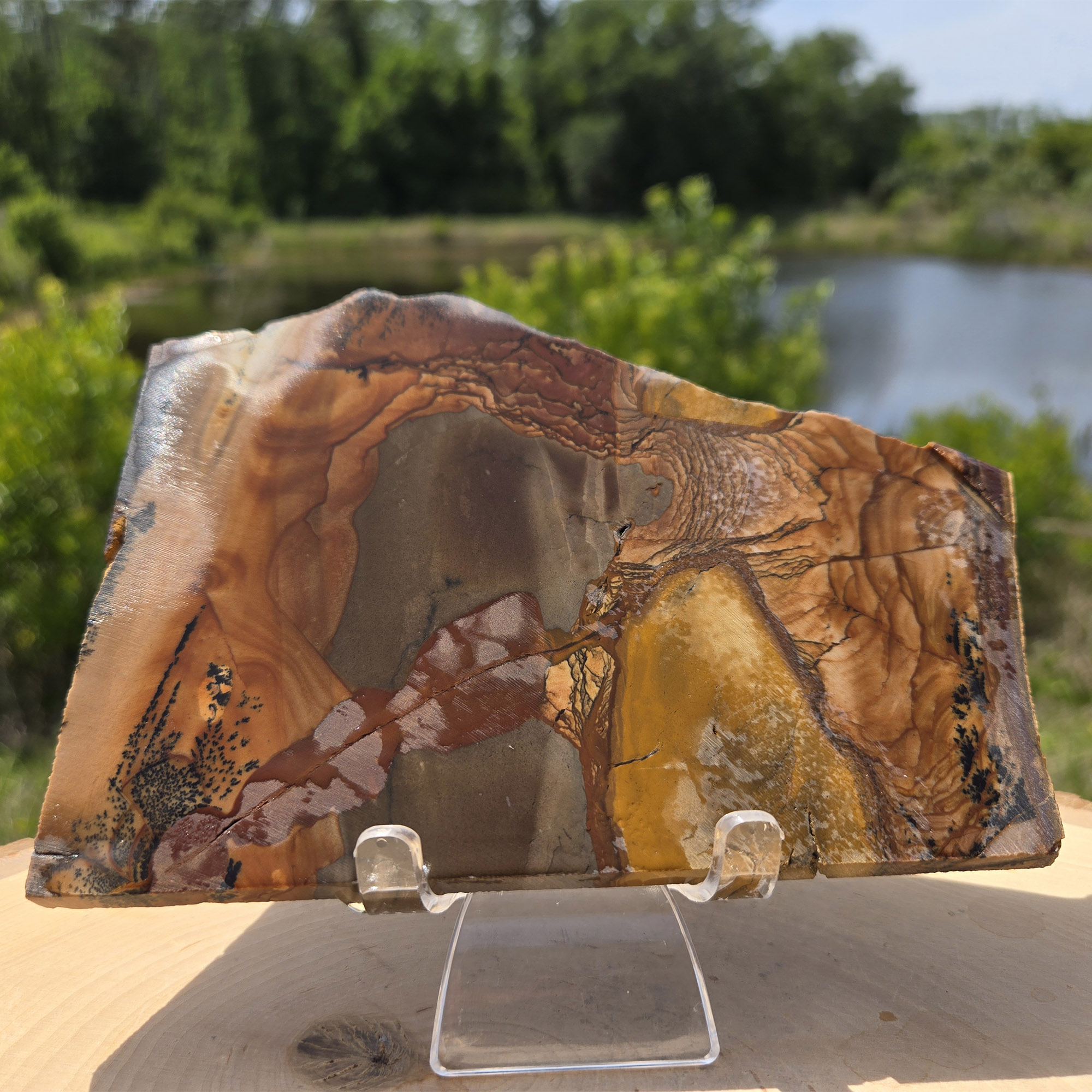 Please note, this is a rough slab. It is not polished on either side. The photos show the slab dry and wet. You will receive the exact item shown.