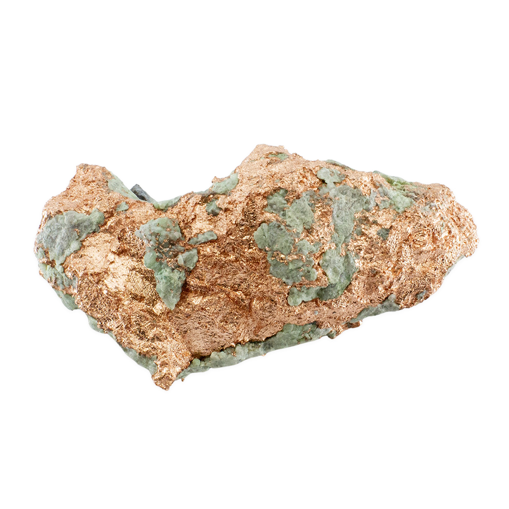 Description: Native Copper. Native copper is copper in its natural, metallic form—not processed or refined. It occurs as free metal rather than in an ore with other elements, which is rare among metals. You can often find it as twisted wires, nuggets, or sheet-like masses.