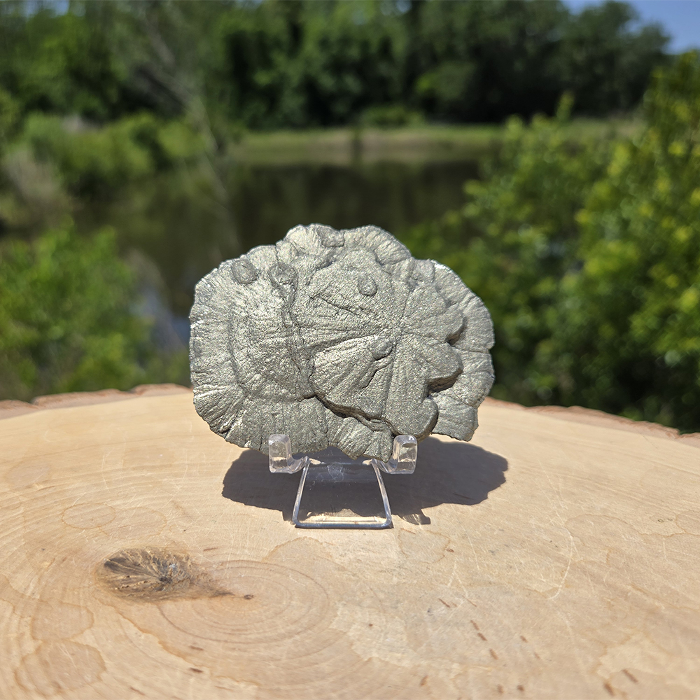 The origin of pyrite suns has been a subject of speculation and debate. While some authorities have speculated they originated as fossils that were subsequently replaced with pyrite, the current consensus is they are concretions spread out under pressure and forced to grow in a laterally compressed, radiating manner in the seams of slate. You will receive the exact item shown.