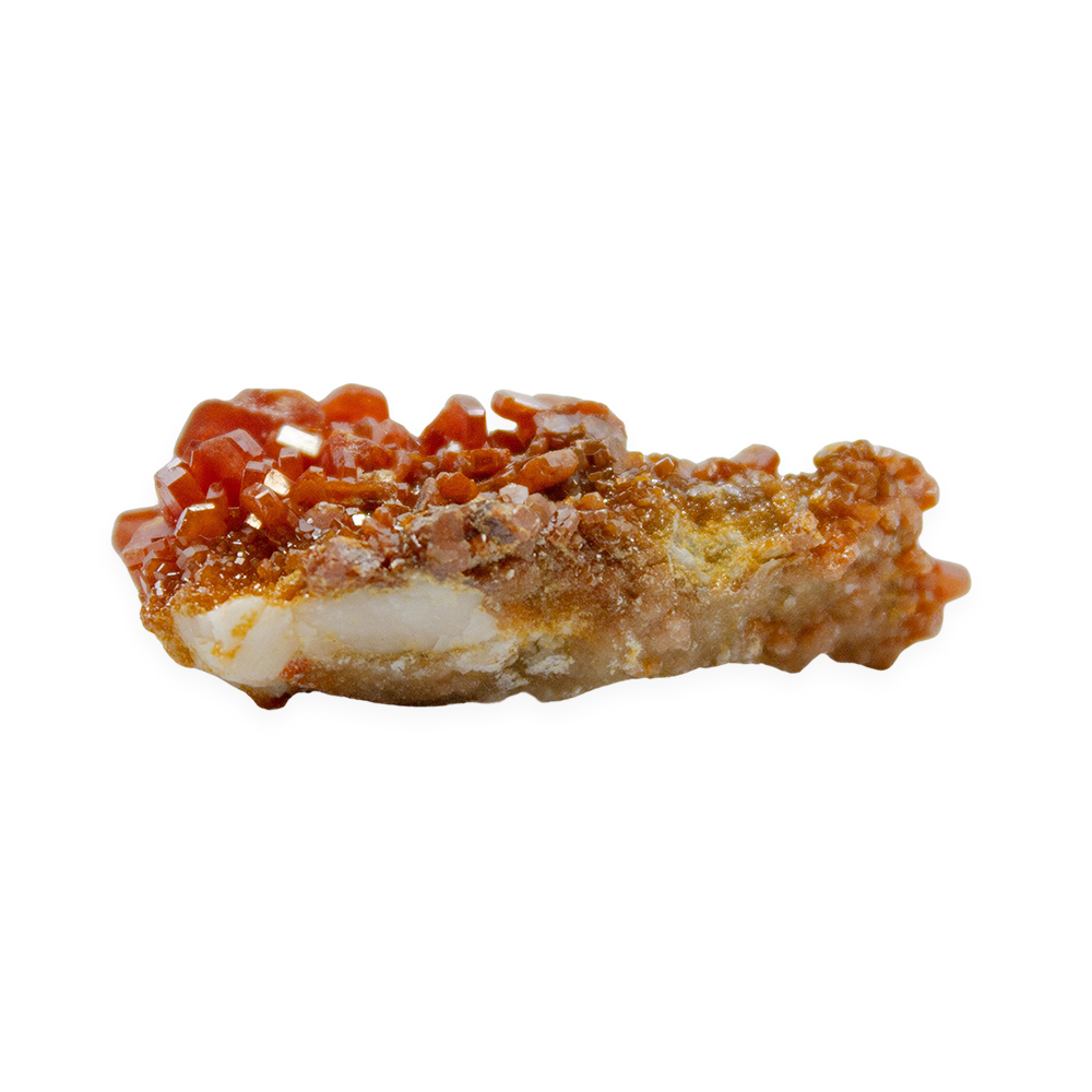 Description: Natural Vanadinite Cluster. Vanadinite is a striking mineral known for its vibrant red to orange hexagonal crystals with a glossy finish. Composed of lead and vanadium, it forms in the oxidized zones of lead deposits and is prized by collectors for its bold color and unique crystal shapes.