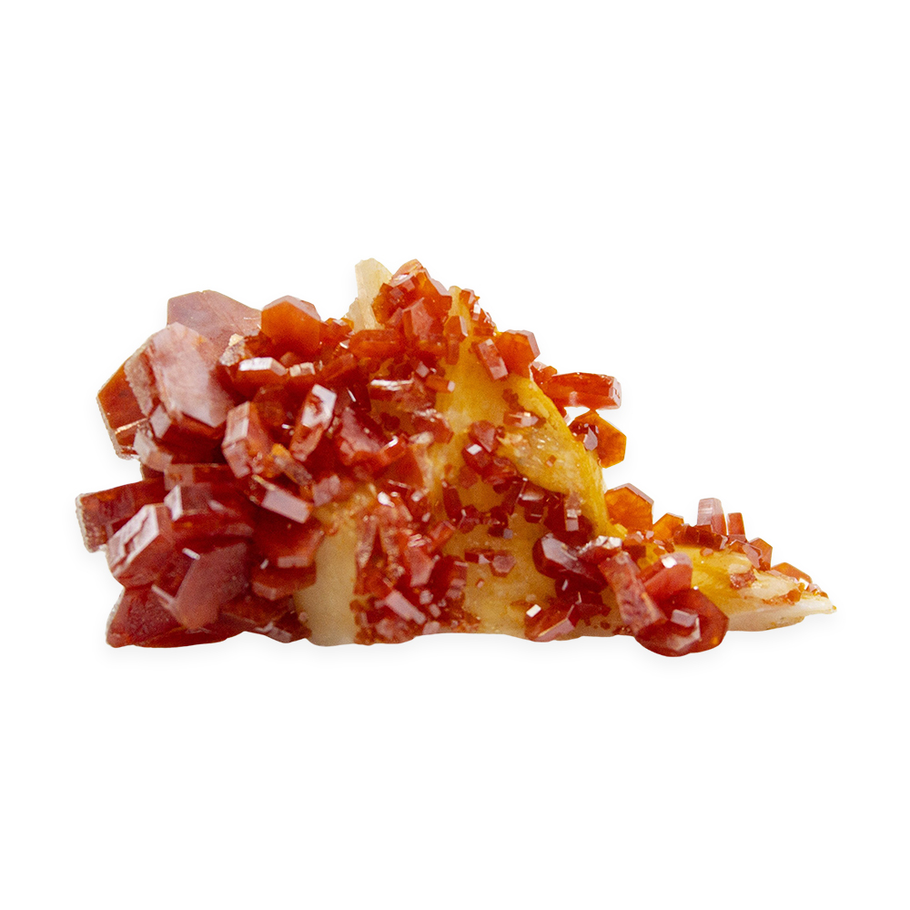 Description: Natural Vanadinite Cluster. Vanadinite is a striking mineral known for its vibrant red to orange hexagonal crystals with a glossy finish. Composed of lead and vanadium, it forms in the oxidized zones of lead deposits and is prized by collectors for its bold color and unique crystal shapes.