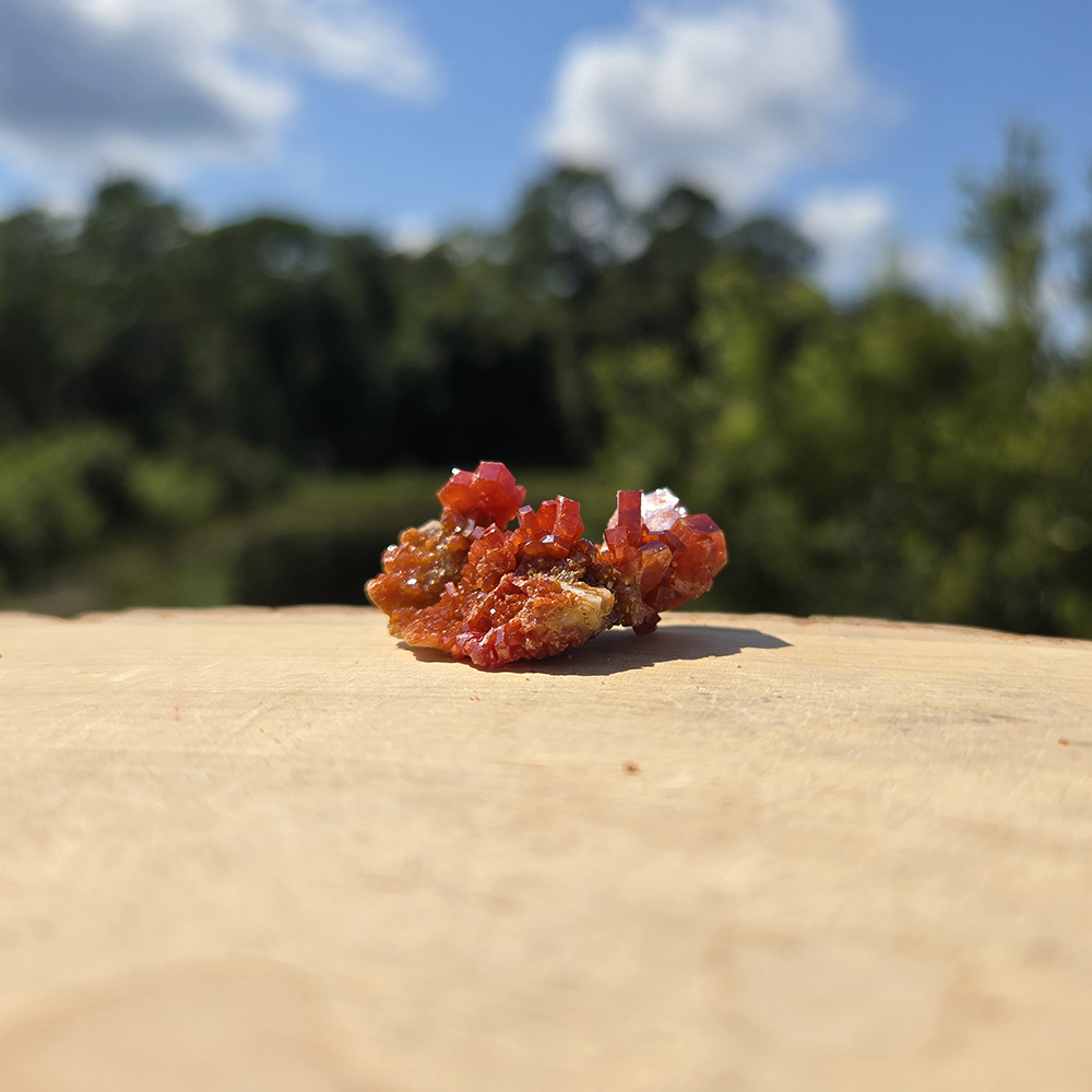 Description: Natural Vanadinite Cluster. Vanadinite is a striking mineral known for its vibrant red to orange hexagonal crystals with a glossy finish. Composed of lead and vanadium, it forms in the oxidized zones of lead deposits and is prized by collectors for its bold color and unique crystal shapes.