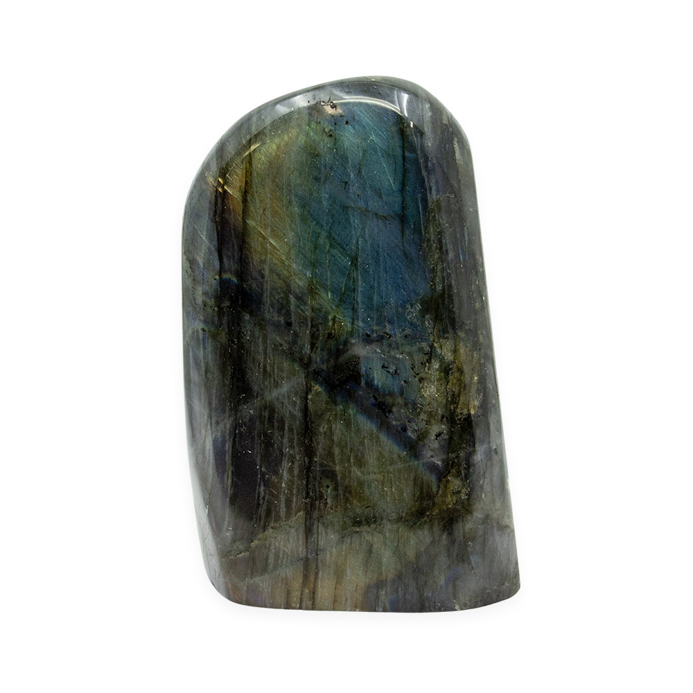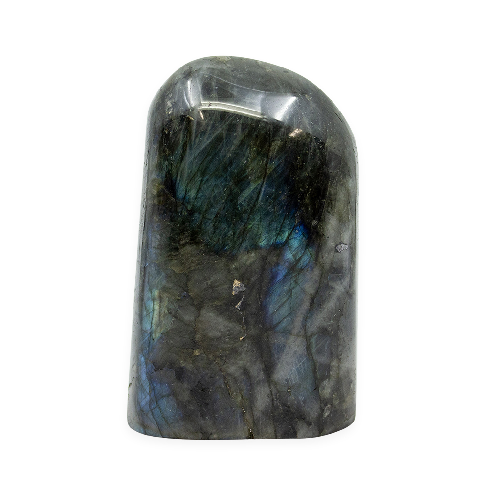 Description: Labradorite Polished Freeform. Labradorite is a member of the Feldspar family and is treasured for its remarkable play of color, known as labradorescence. The stone, usually gray-green, dark gray, black, or grayish-white, is composed of aggregate layers that refract light as iridescent flashes of peacock blue, gold, pale green, or coppery red. The predominant blue varies within the light, displaying hues from deepest blue to various shades of pale, almost blue-green.