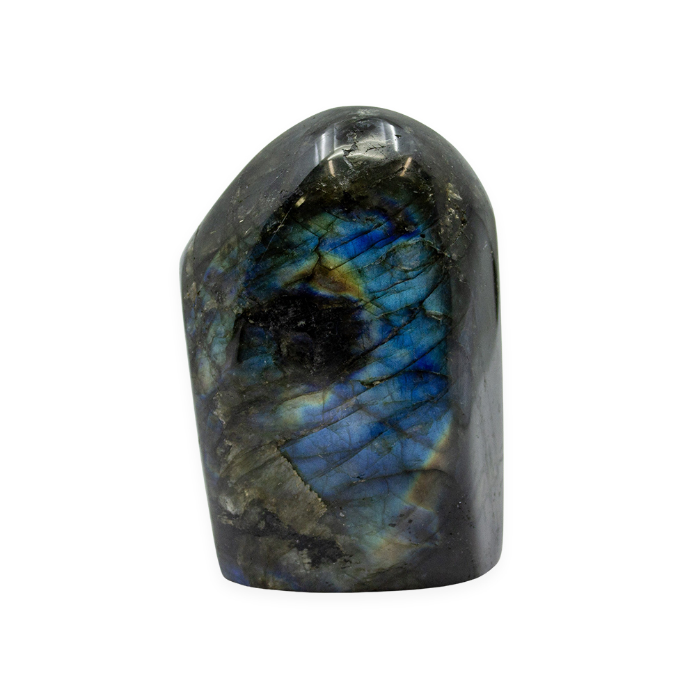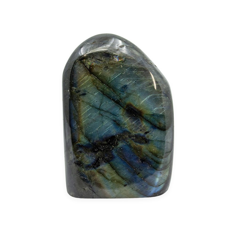 Description: Labradorite Polished Freeform. Labradorite is a member of the Feldspar family and is treasured for its remarkable play of color, known as labradorescence. The stone, usually gray-green, dark gray, black, or grayish-white, is composed of aggregate layers that refract light as iridescent flashes of peacock blue, gold, pale green, or coppery red. The predominant blue varies within the light, displaying hues from deepest blue to various shades of pale, almost blue-green.