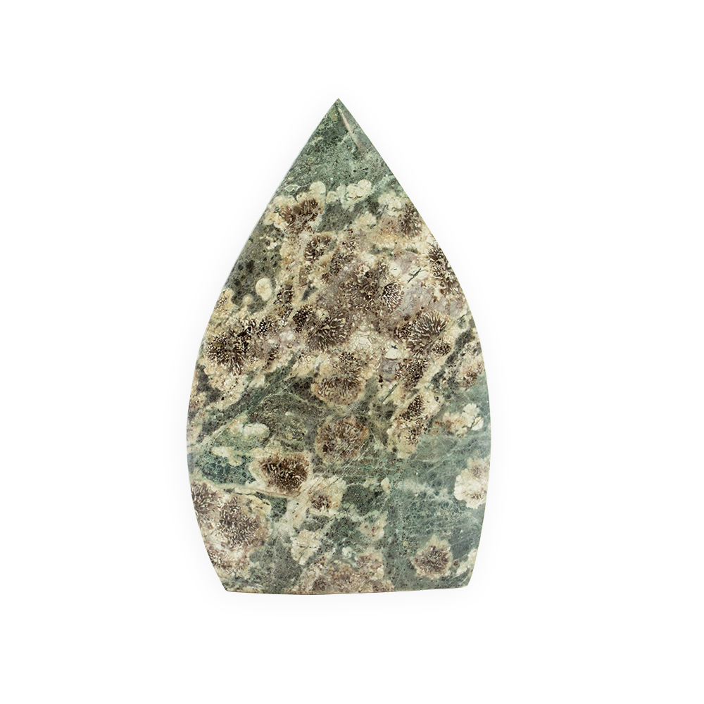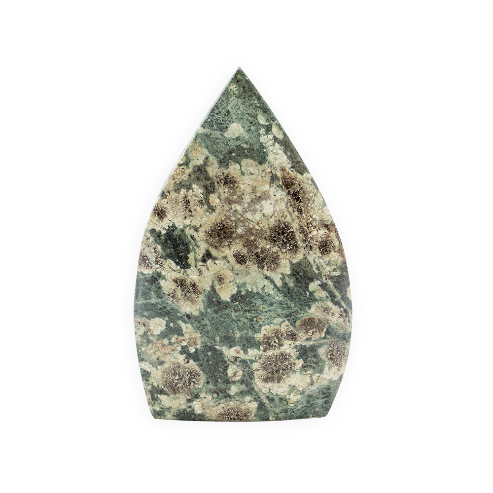 Description: Green Flower Jasper Freeform. Green Flower Jasper is a type of jasper characterized by its green base color, complemented by natural, flower-like patterns (often creamy, tan, or brown) that resemble tiny blossoms or mossy blooms. These “flowers” are actually mineral inclusions, usually chalcedony and iron oxide, formed over millions of years as volcanic sediments and silica-rich fluids settled and hardened.