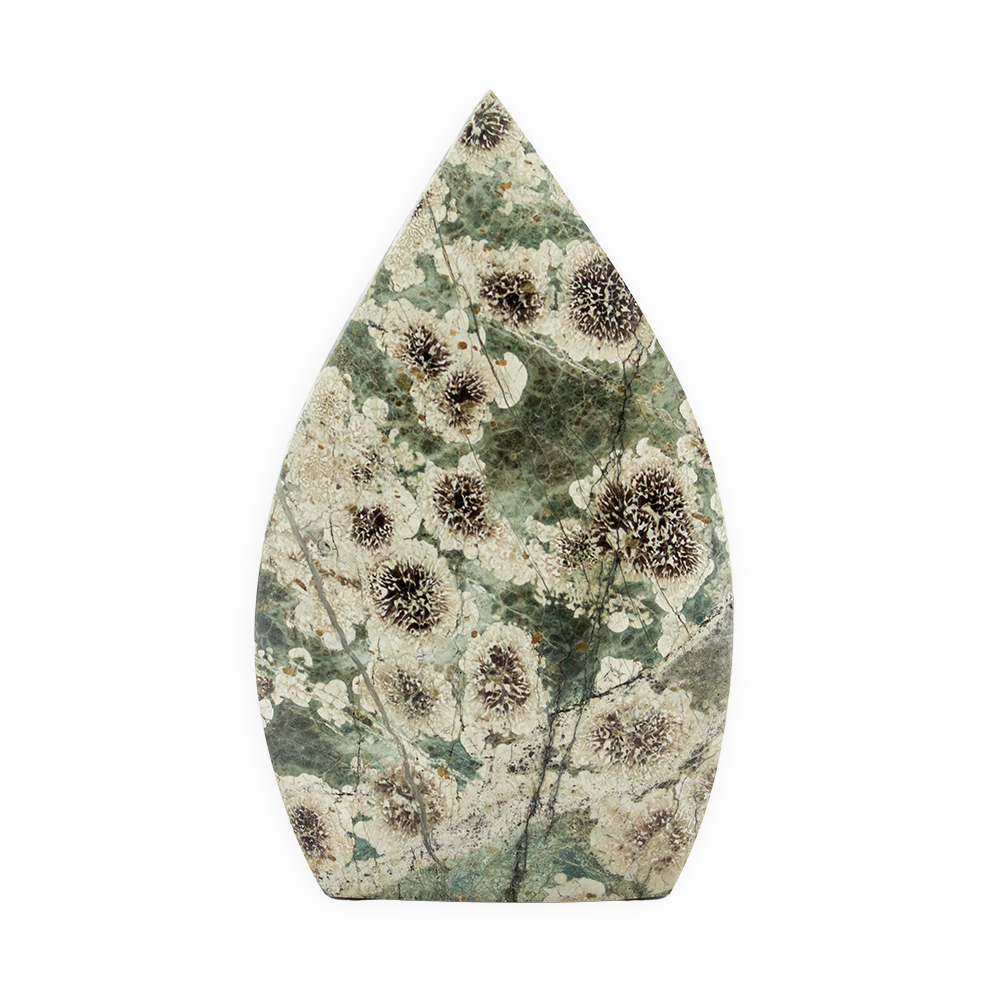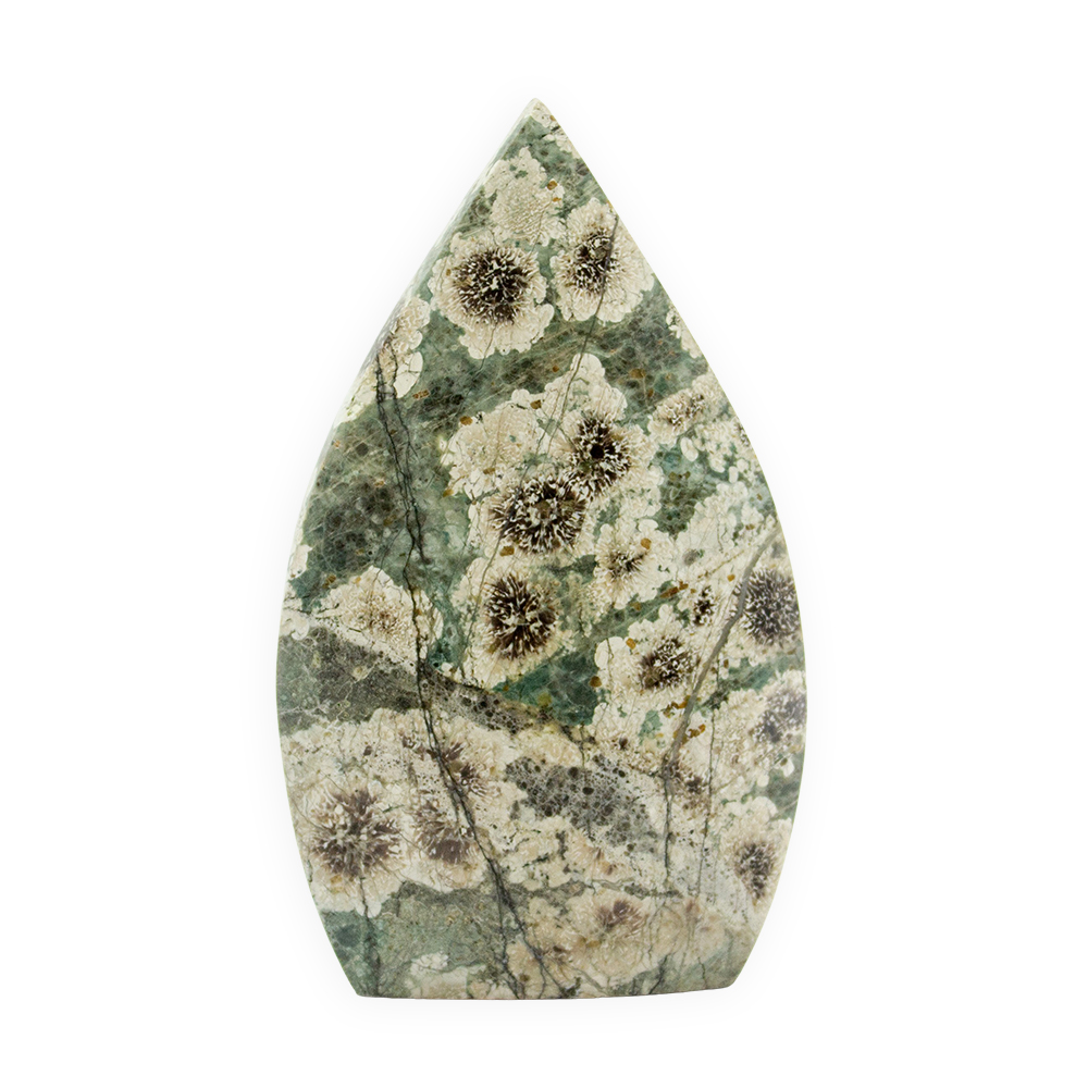 Description: Green Flower Jasper Freeform. Green Flower Jasper is a type of jasper characterized by its green base color, complemented by natural, flower-like patterns (often creamy, tan, or brown) that resemble tiny blossoms or mossy blooms. These “flowers” are actually mineral inclusions, usually chalcedony and iron oxide, formed over millions of years as volcanic sediments and silica-rich fluids settled and hardened.