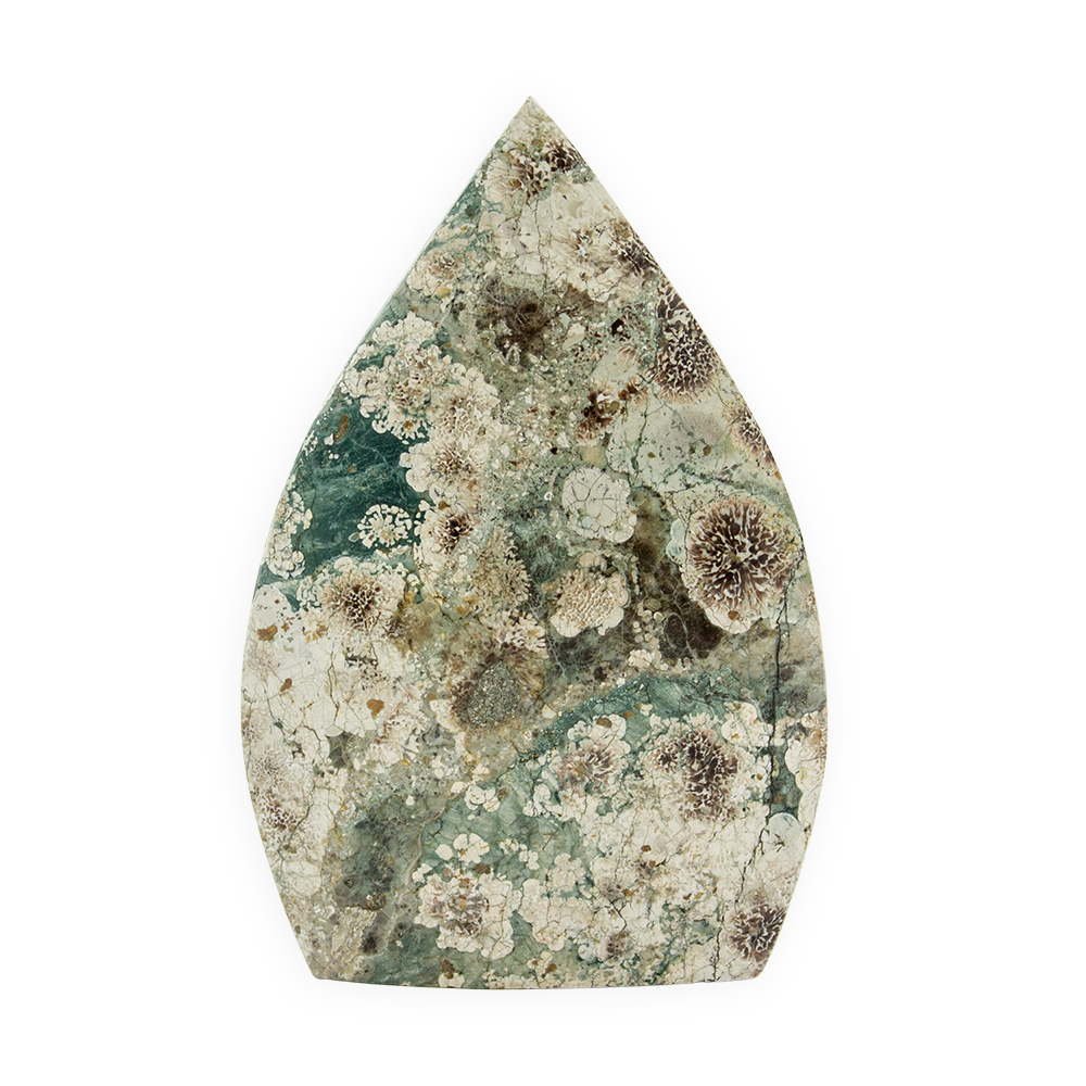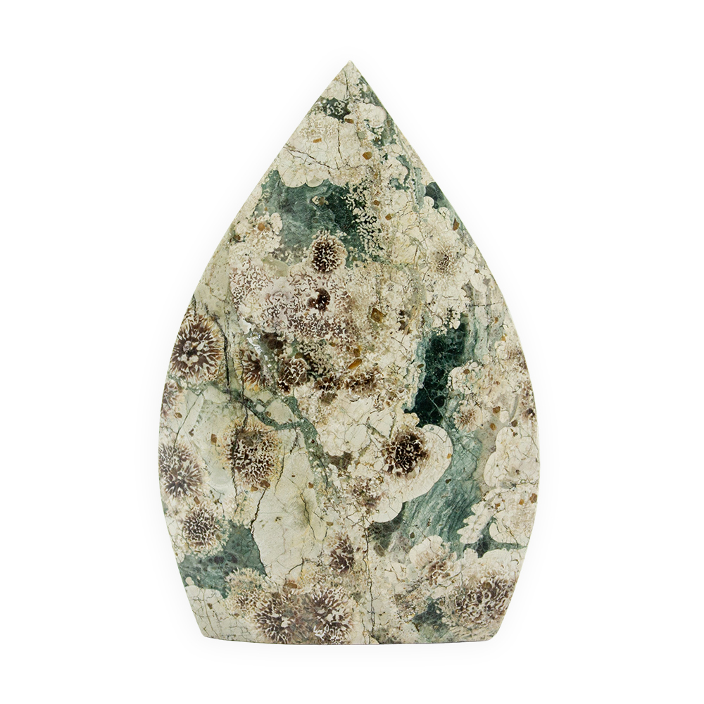 Description: Green Flower Jasper Freeform. Green Flower Jasper is a type of jasper characterized by its green base color, complemented by natural, flower-like patterns (often creamy, tan, or brown) that resemble tiny blossoms or mossy blooms. These “flowers” are actually mineral inclusions, usually chalcedony and iron oxide, formed over millions of years as volcanic sediments and silica-rich fluids settled and hardened.