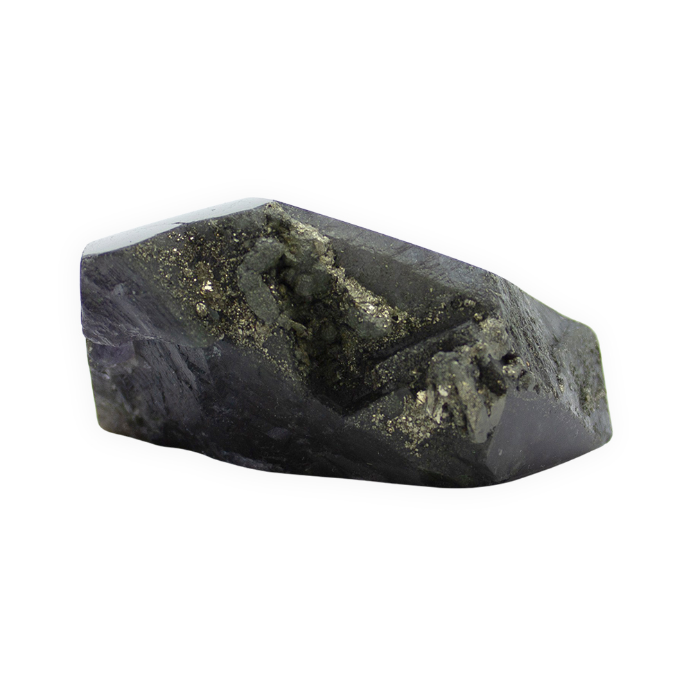 Description: Fluorite with Pyrite Freeform. Fluorite forms in a wide variety of hues, typically purple, green, yellow, blue, and pure form – colorless. It is composed of calcium fluoride and is a member of the Halide family.