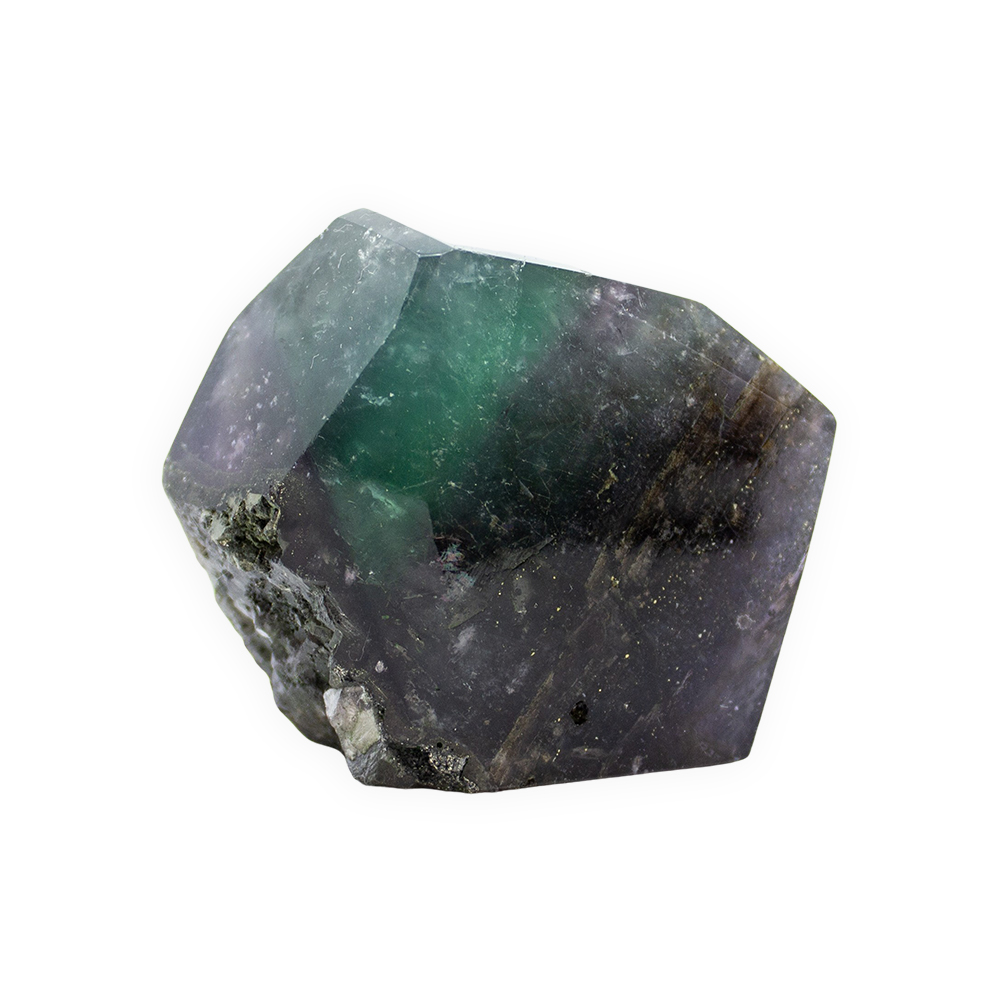 Description: Fluorite with Pyrite Freeform. Fluorite forms in a wide variety of hues, typically purple, green, yellow, blue, and pure form – colorless. It is composed of calcium fluoride and is a member of the Halide family.