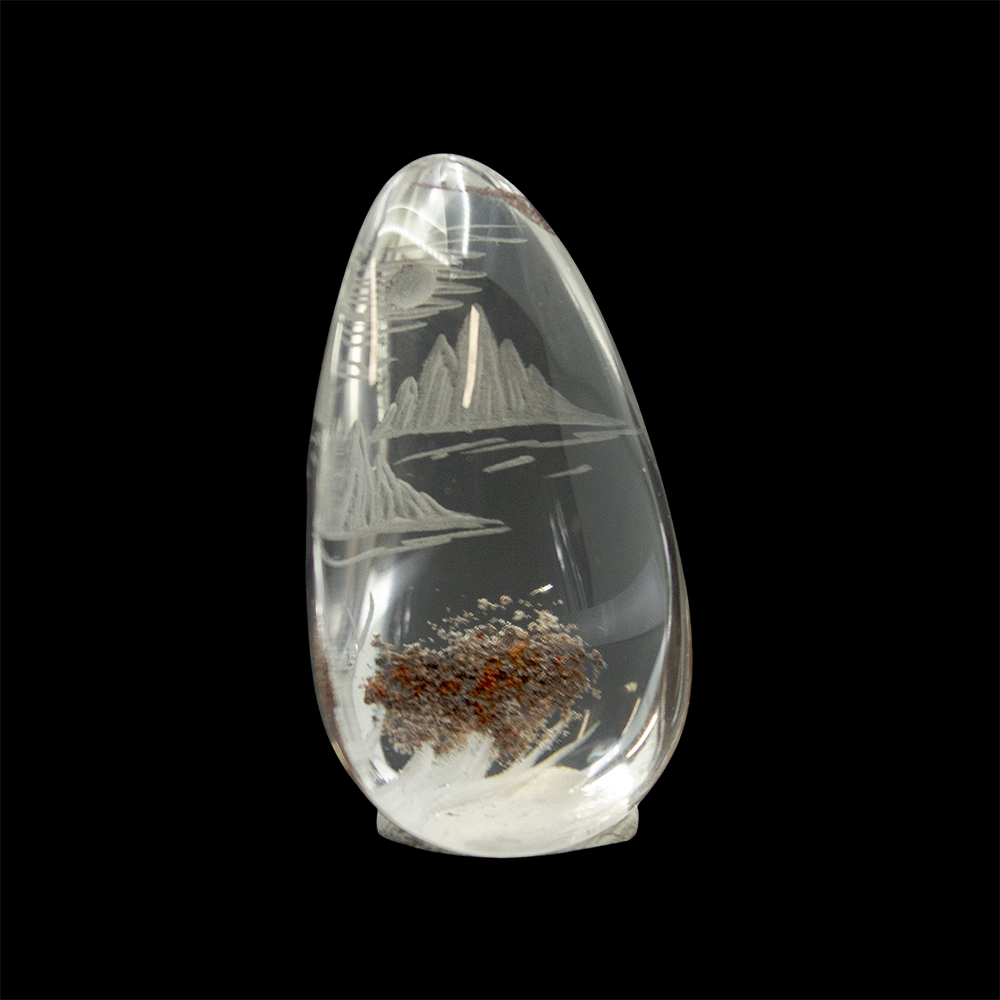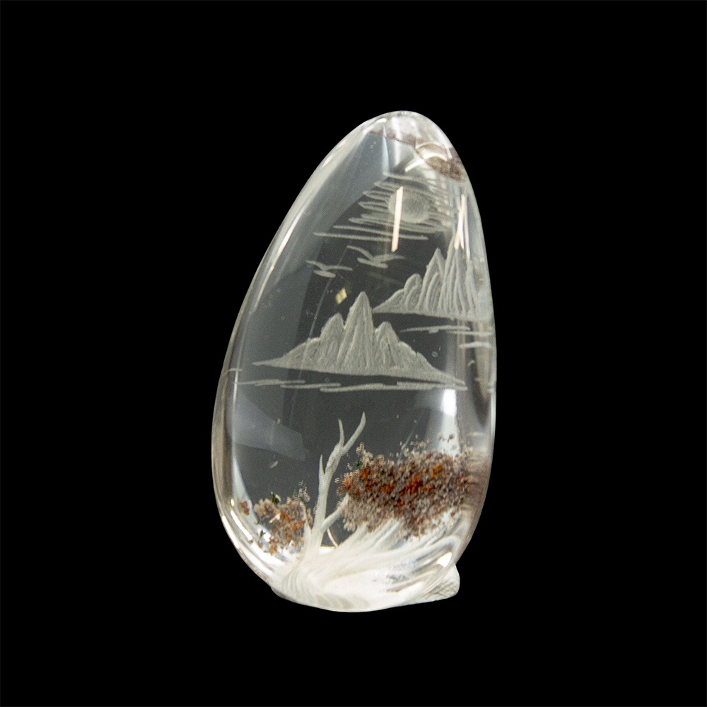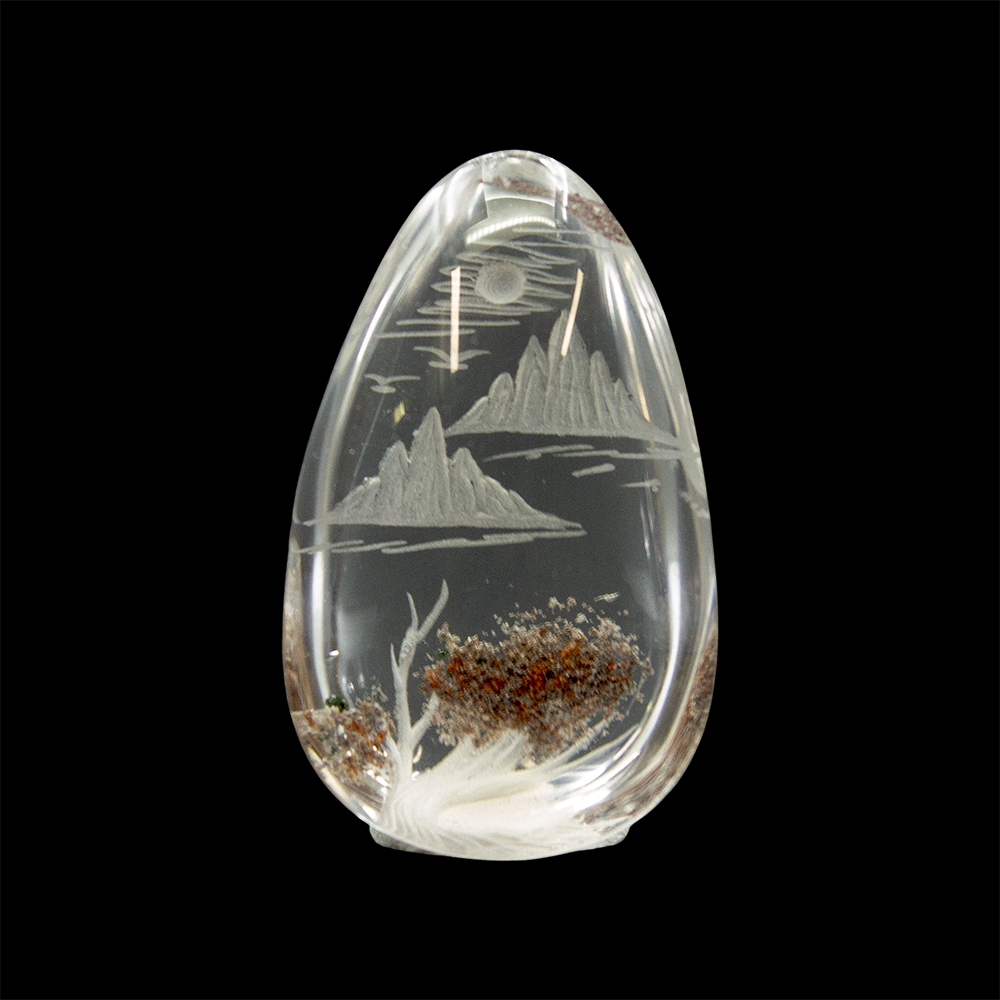 DESCRIPTION: Lodolite Quartz, also known as Garden Quartz, features inclusions of chlorite, iron, and other minerals, resembling a miniature, enchanted landscape. Some common types of inclusions are chlorite, which gives off green hues, iron oxides, which give off red-ish, smoky hues, and/or other stones/minerals. Engraved with a beautiful nature scene.
