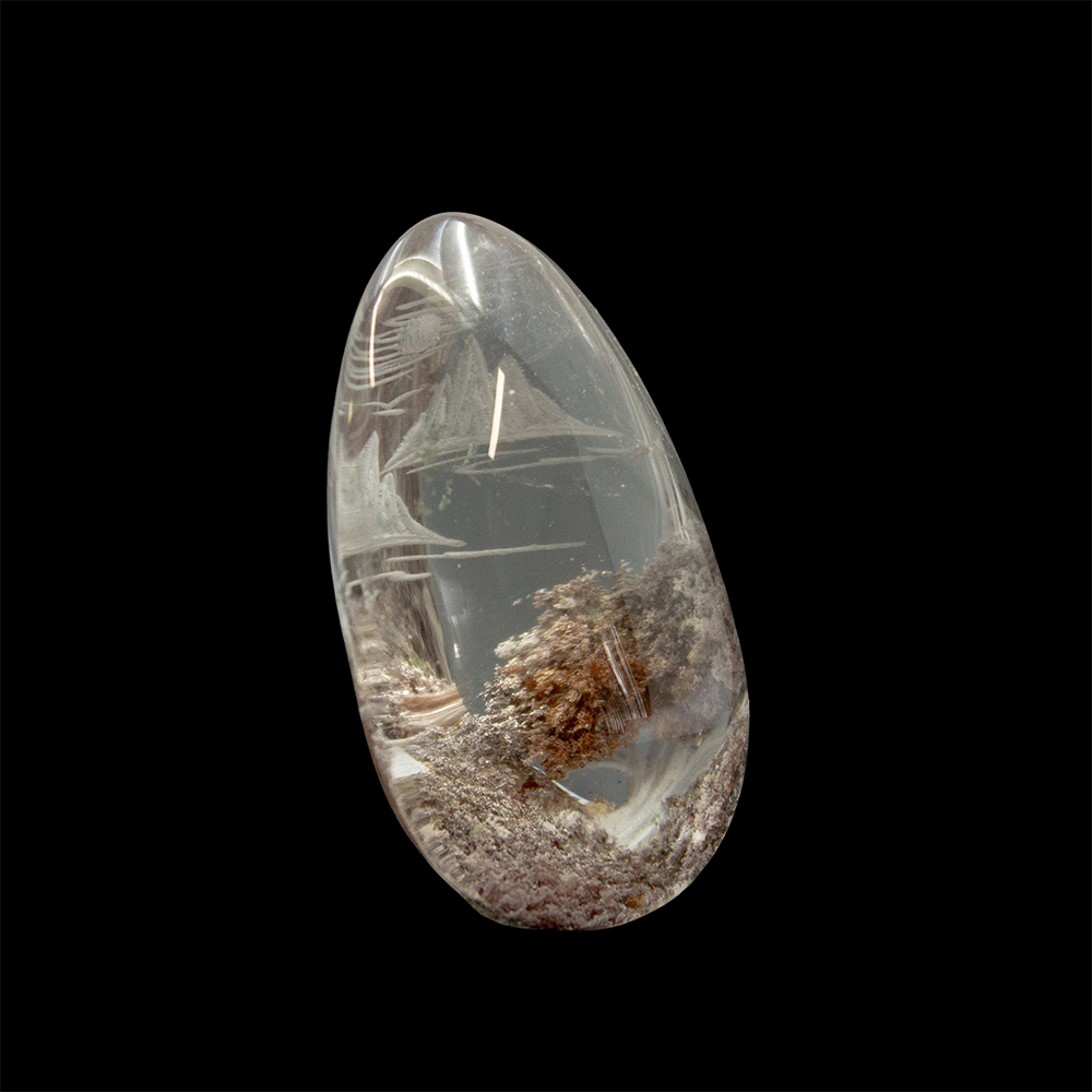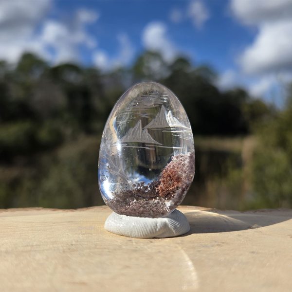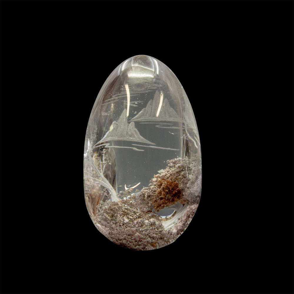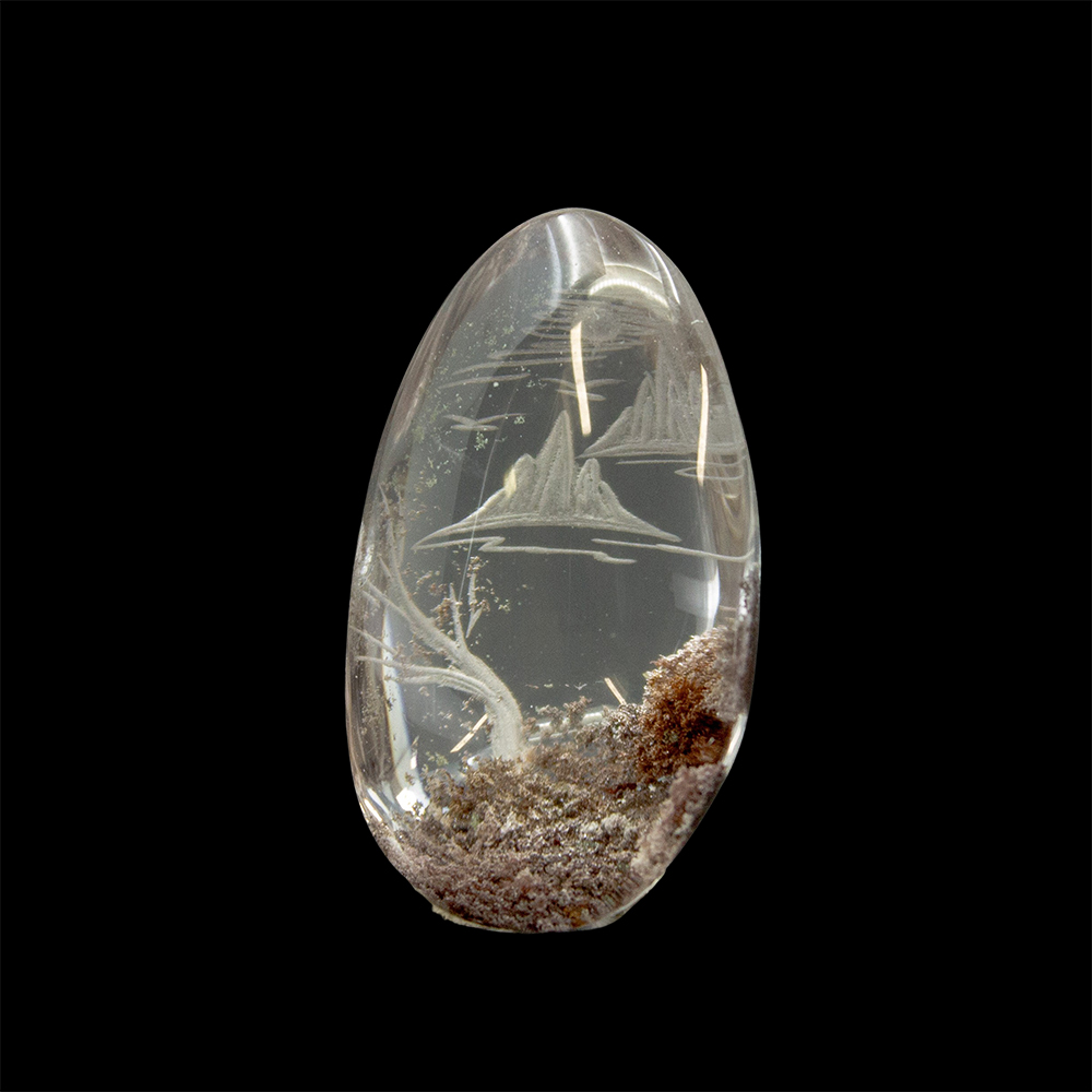 DESCRIPTION: Lodolite Quartz, also known as Garden Quartz, features inclusions of chlorite, iron, and other minerals, resembling a miniature, enchanted landscape. Some common types of inclusions are chlorite, which gives off green hues, iron oxides, which give off red-ish, smoky hues, and/or other stones/minerals. Engraved with a beautiful nature scene.