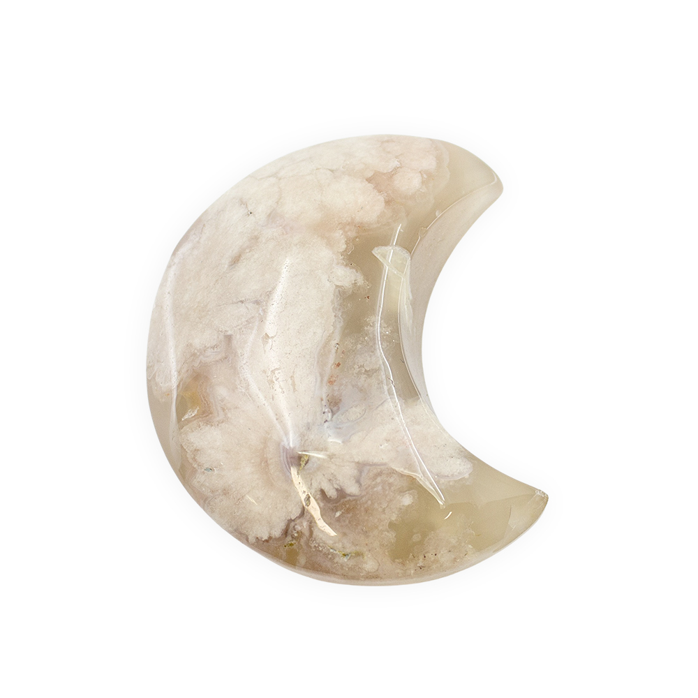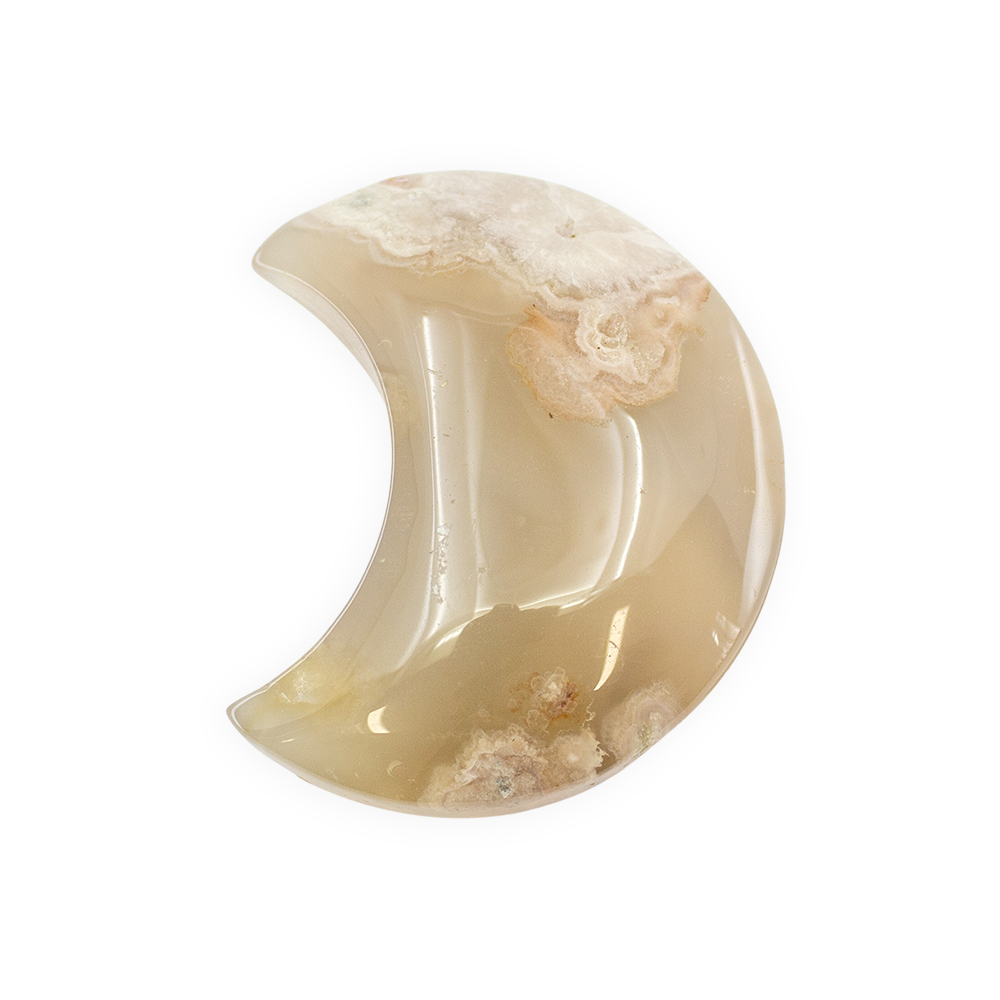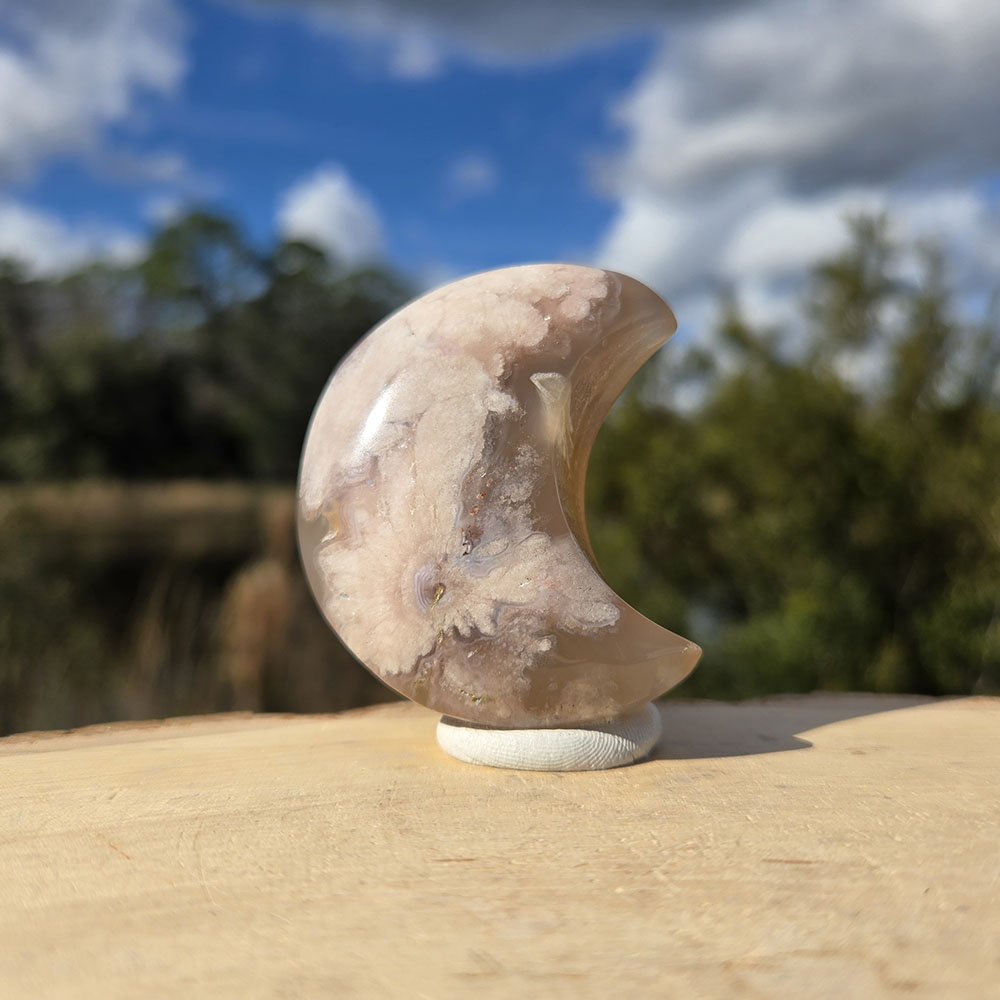 Description: Flower Agate Moon. This stone is pure, undyed, and full of vibrant energy. Flower Agate is a light pink Agate with plume-like inclusions. Rough areas are natural to this stone.
