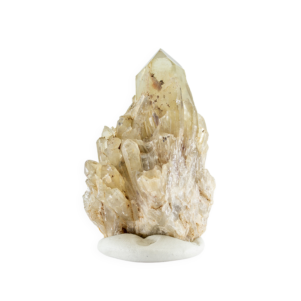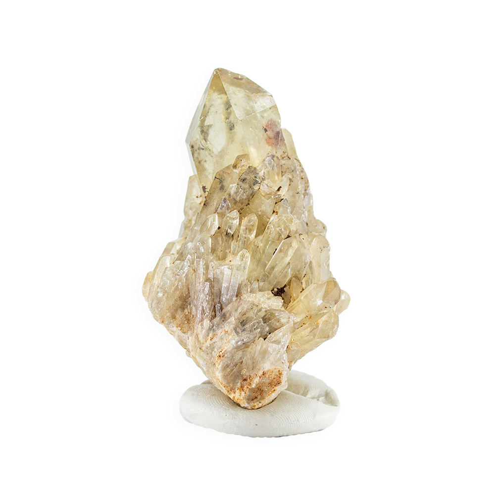 This crystal is a Cathedral. A Cathedral crystal contains a prominent point with parallel points stepping up around all sides, rather like candle drippings.” It is usually an opaque crystal formation of one main central point and surrounding parallel ones usually of different widths and lengths, but shorter than the main crystal, all growing on a common base. We offer a detailed description of the many shapes of quartz crystals to help you find the power and energy of this item. See our Quartz Crystals Explained section while you explore this great crystal. These crystals can seem uncommonly inert and lifeless when first encountered. However, with familiarity and careful study, they are warm and seem to be filled with an eerie inner glow often reported to be a faint violet color. If you seek wisdom, enlightenment, and a deep understanding of mankind’s place in the universe, both physical and spiritual, no better meditation crystal exists.