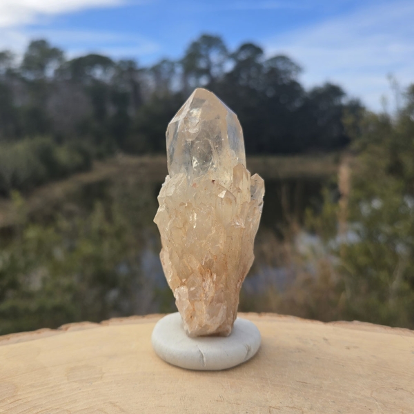 This crystal is a Cathedral. A Cathedral crystal contains a prominent point with parallel points stepping up around all sides, rather like candle drippings.” It is usually an opaque crystal formation of one main central point and surrounding parallel ones usually of different widths and lengths, but shorter than the main crystal, all growing on a common base. We offer a detailed description of the many shapes of quartz crystals to help you find the power and energy of this item. See our Quartz Crystals Explained section while you explore this great crystal. These crystals can seem uncommonly inert and lifeless when first encountered. However, with familiarity and careful study, they are warm and seem to be filled with an eerie inner glow often reported to be a faint violet color. If you seek wisdom, enlightenment, and a deep understanding of mankind’s place in the universe, both physical and spiritual, no better meditation crystal exists.