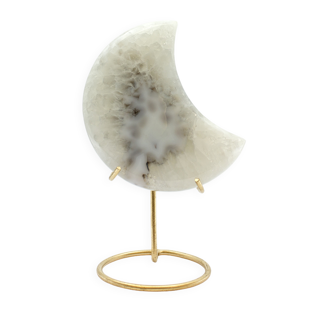 Description: Agate Druzy Moon with Stand. Druzy Agate is a variety of Agate distinguished by its surface adorned with tiny, glittering crystals known as “druzy.” These minute crystals form when mineral-rich water permeates a rock’s surface, and upon evaporation, leaves behind a layer of crystals.