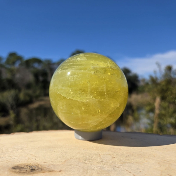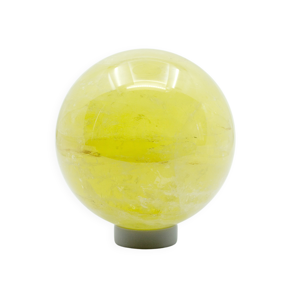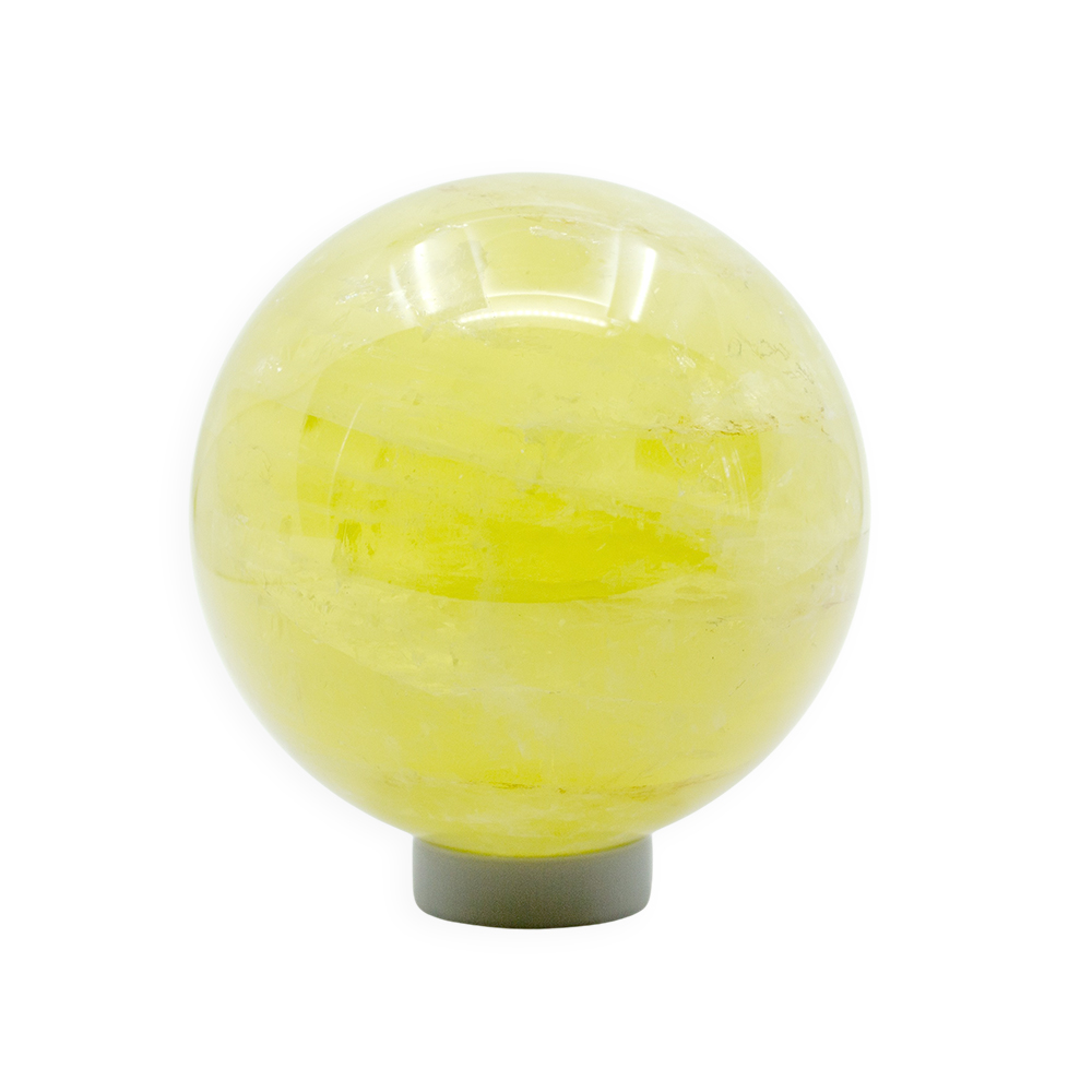 Description: Lemon Quartz Sphere. Lemon quartz is a transparent, vibrant yellow variety of quartz whose color is often enhanced by gamma irradiation and heat applied to iron-rich quartz, producing its bright, lemon-yellow hue.
