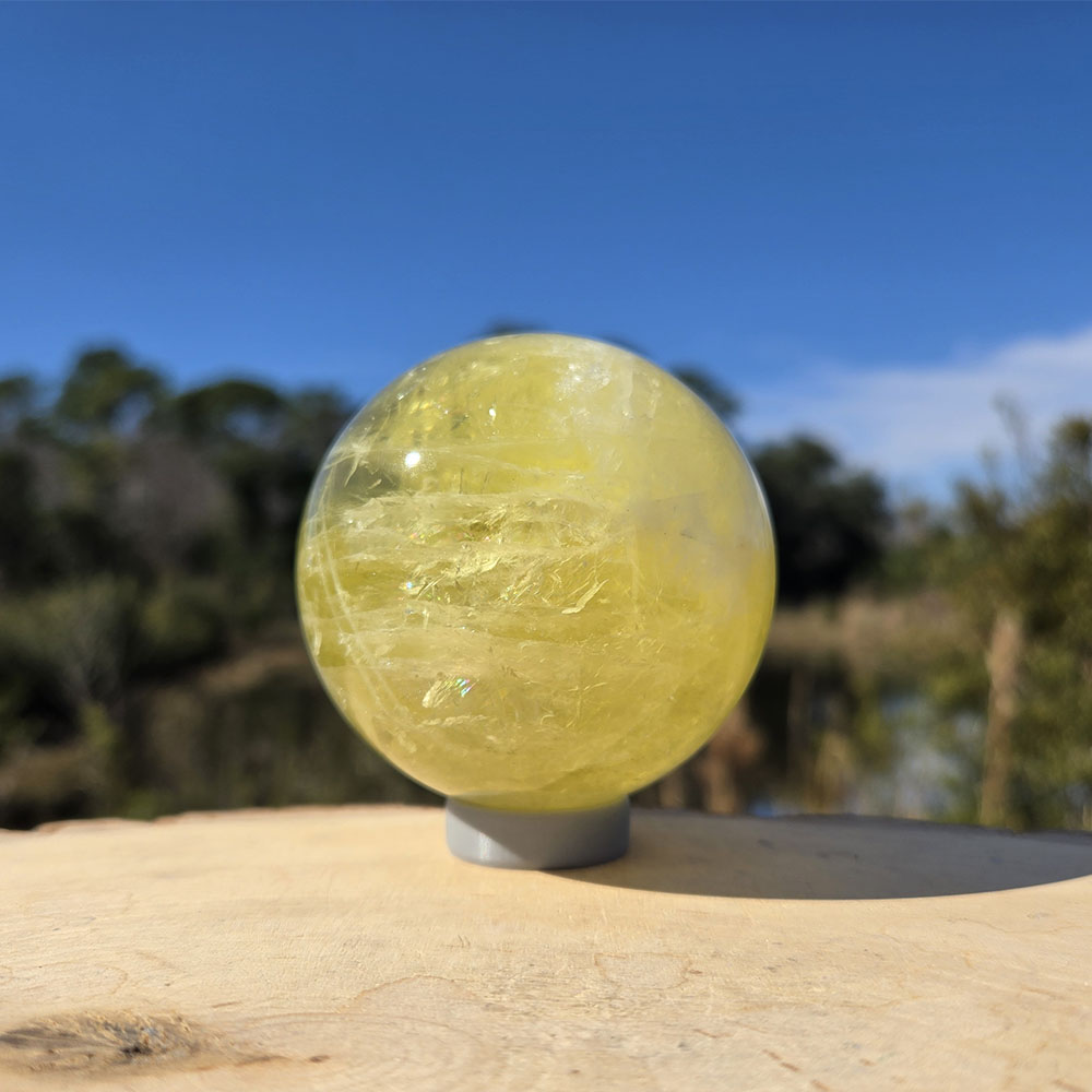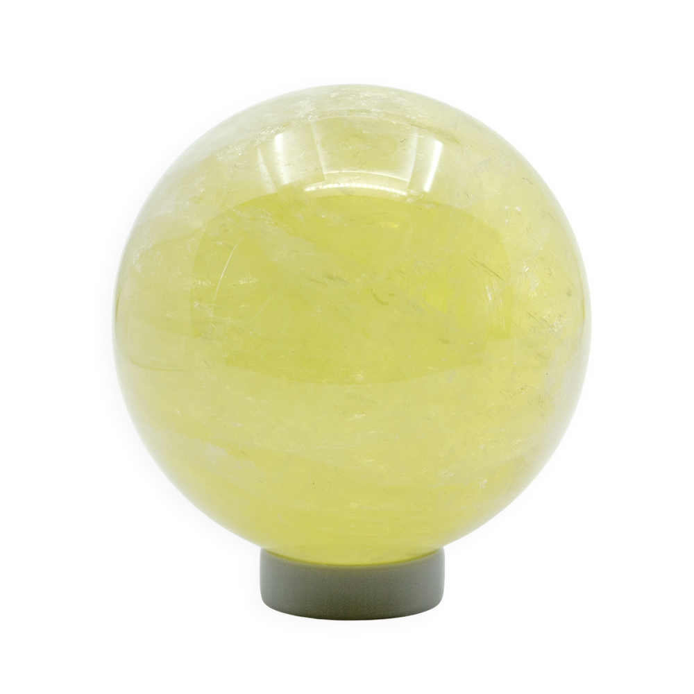 Description: Lemon Quartz Sphere. Lemon quartz is a transparent, vibrant yellow variety of quartz whose color is often enhanced by gamma irradiation and heat applied to iron-rich quartz, producing its bright, lemon-yellow hue.