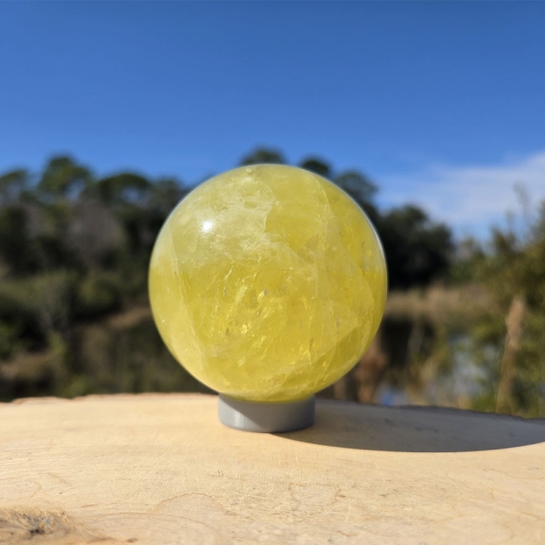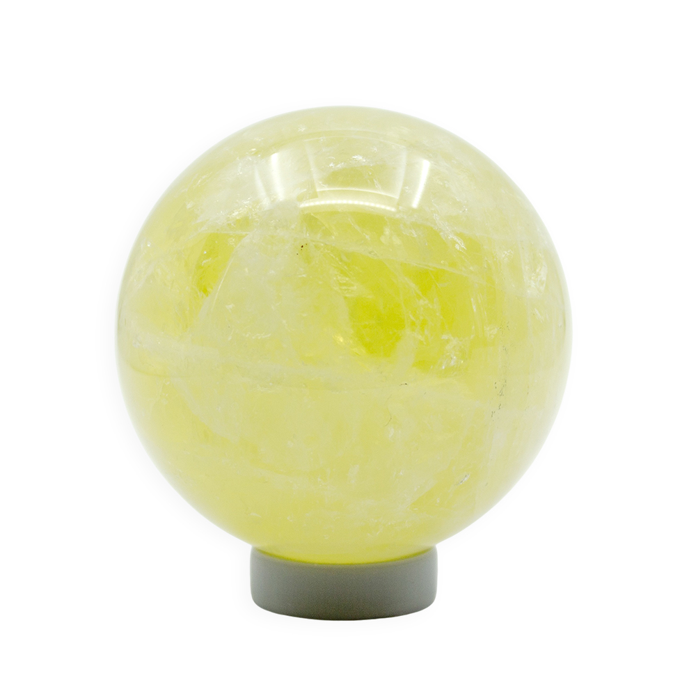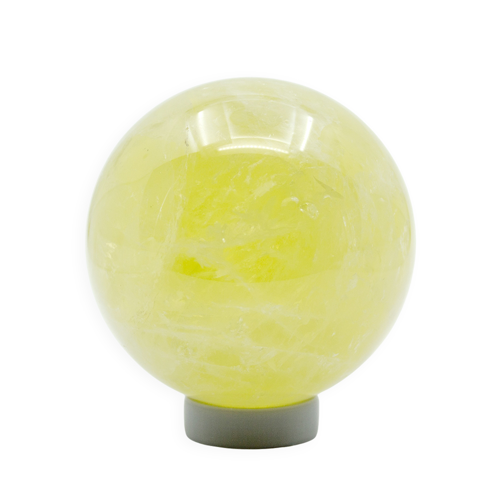 Description: Lemon Quartz Sphere. Lemon quartz is a transparent, vibrant yellow variety of quartz whose color is often enhanced by gamma irradiation and heat applied to iron-rich quartz, producing its bright, lemon-yellow hue.