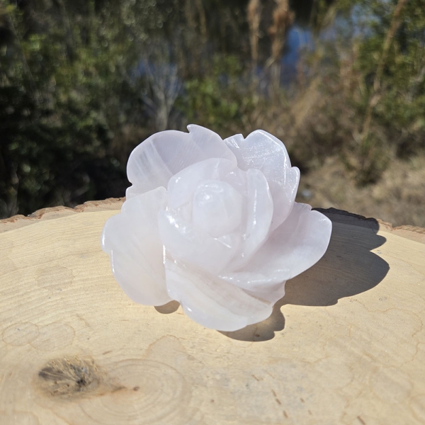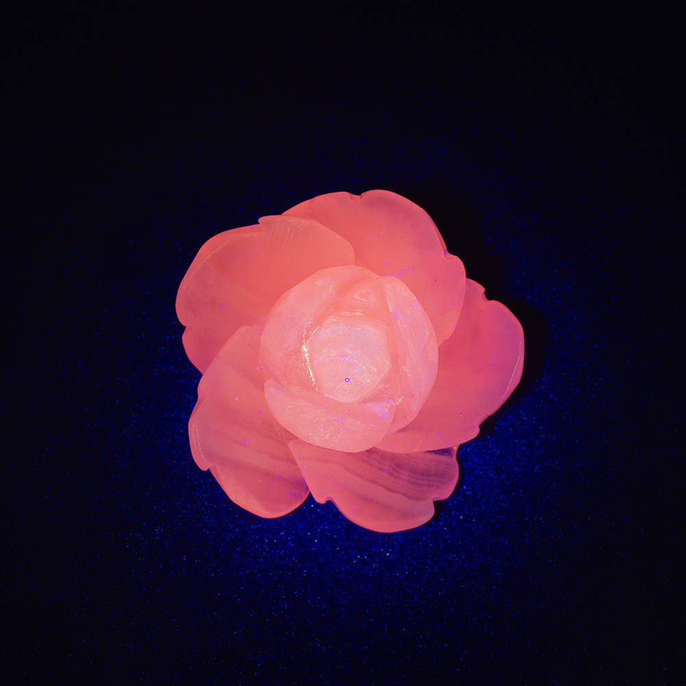 Description: Pink Mangano Calcite Carved Rose. Pink Mangano Calcite (often just called Mangano Calcite) is a soft pink variety of Calcite that gets its color from manganese. It’s one of those stones that are described as gentle but powerful. Under ultraviolet light, Pink Mangano Calcite glows a vivid neon pink, which is one of its most distinctive and fun features.