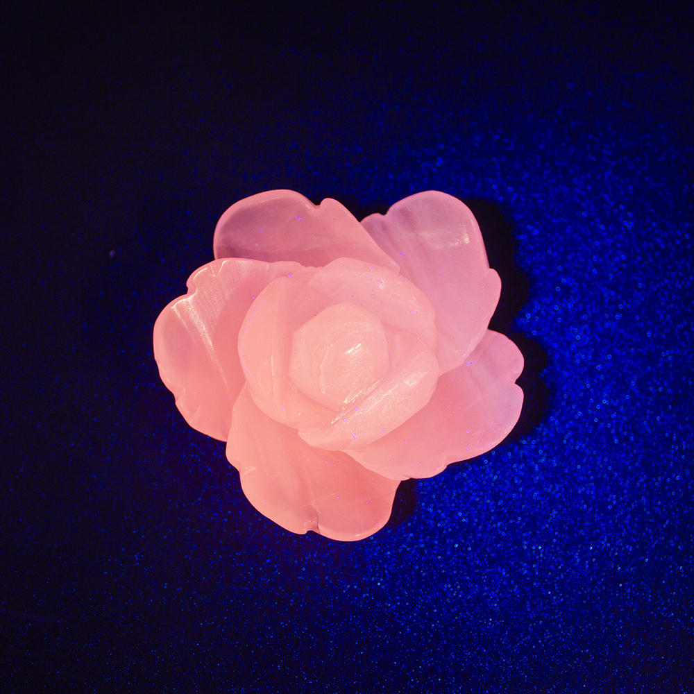 Description: Pink Mangano Calcite Carved Rose. Pink Mangano Calcite (often just called Mangano Calcite) is a soft pink variety of Calcite that gets its color from manganese. It’s one of those stones that are described as gentle but powerful. Under ultraviolet light, Pink Mangano Calcite glows a vivid neon pink, which is one of its most distinctive and fun features.