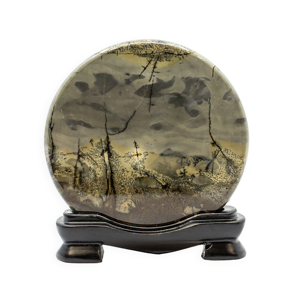 Description: Picture Jasper Slab with Stand. Picture Jasper is a type of Jasper, which is an opaque, fine‑grained variety of Quartz. What makes Picture Jasper special is its scenic, landscape‑like patterns that often look like natural scenes, think mountains, rolling hills, desert landscapes, or abstract “paintings” captured in stone. Typical hues include browns, tans, creams, yellows, and greens, created by mineral impurities (like iron oxides).