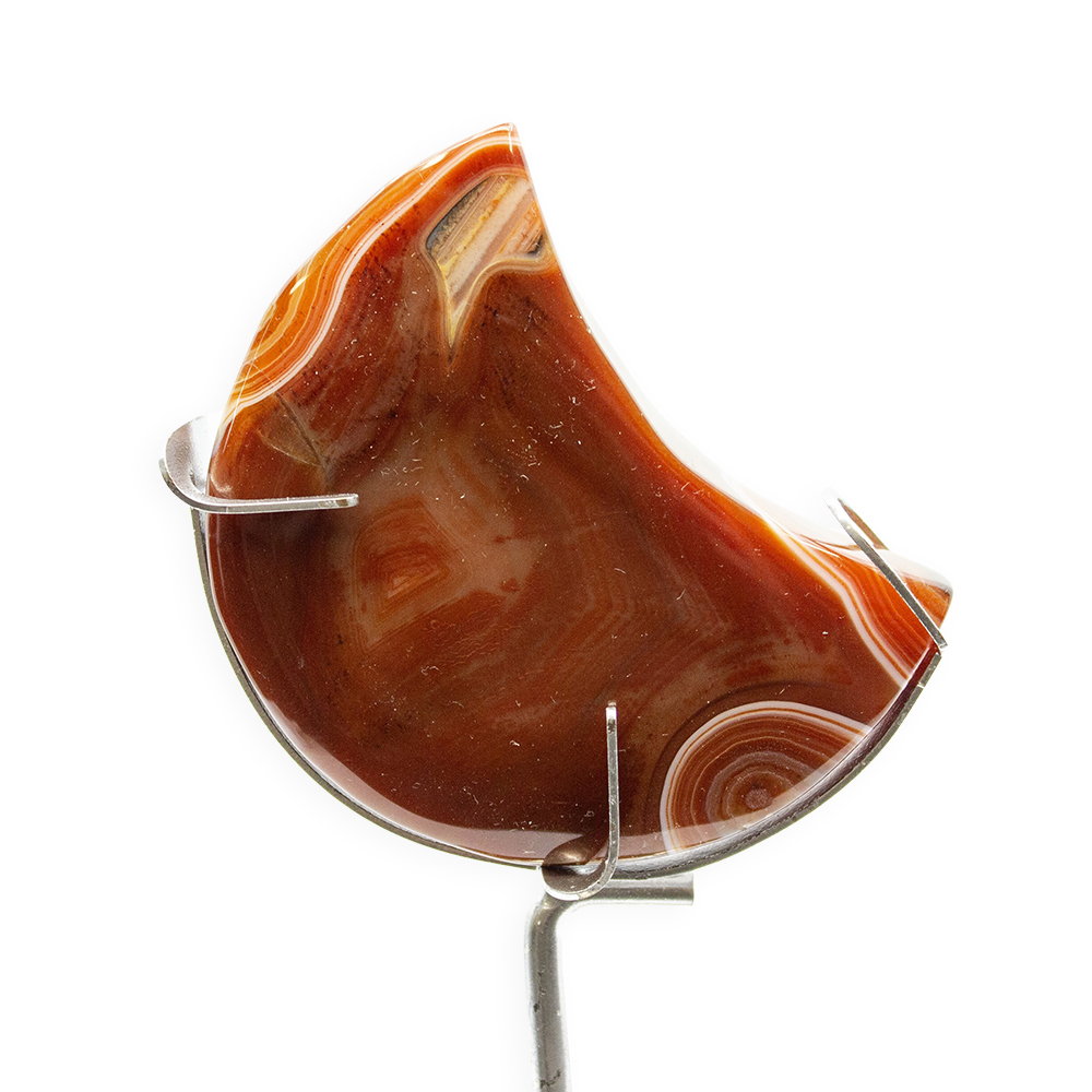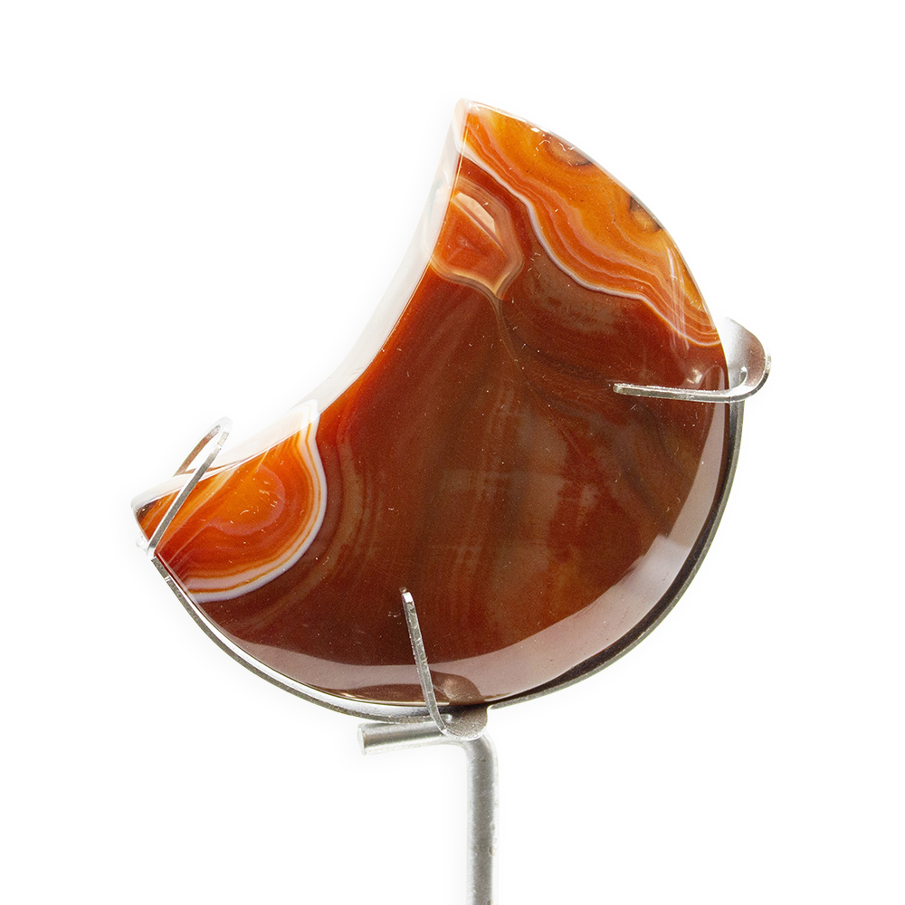 DESCRIPTION: Carnelian Moon with Zodiac Stand. A glassy, translucent stone, Carnelian is an orange-colored variety of Chalcedony, a mineral of the Quartz family. Its color varies from pale pinkish-orange to a deep rusty brown, though it is most known for its brilliant orange and red-orange crystals. Cracks and fractures are natural to the stone.