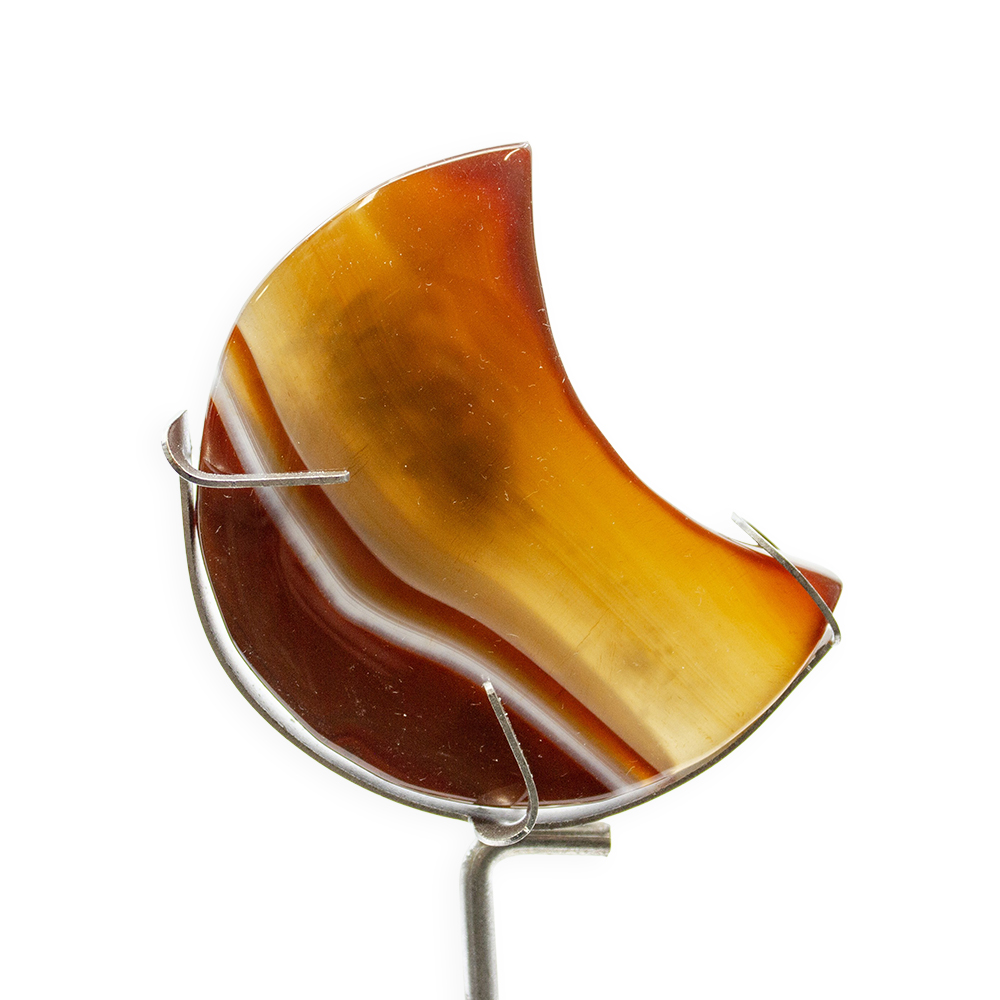 DESCRIPTION: Carnelian Moon with Zodiac Stand. A glassy, translucent stone, Carnelian is an orange-colored variety of Chalcedony, a mineral of the Quartz family. Its color varies from pale pinkish-orange to a deep rusty brown, though it is most known for its brilliant orange and red-orange crystals. Cracks and fractures are natural to the stone.