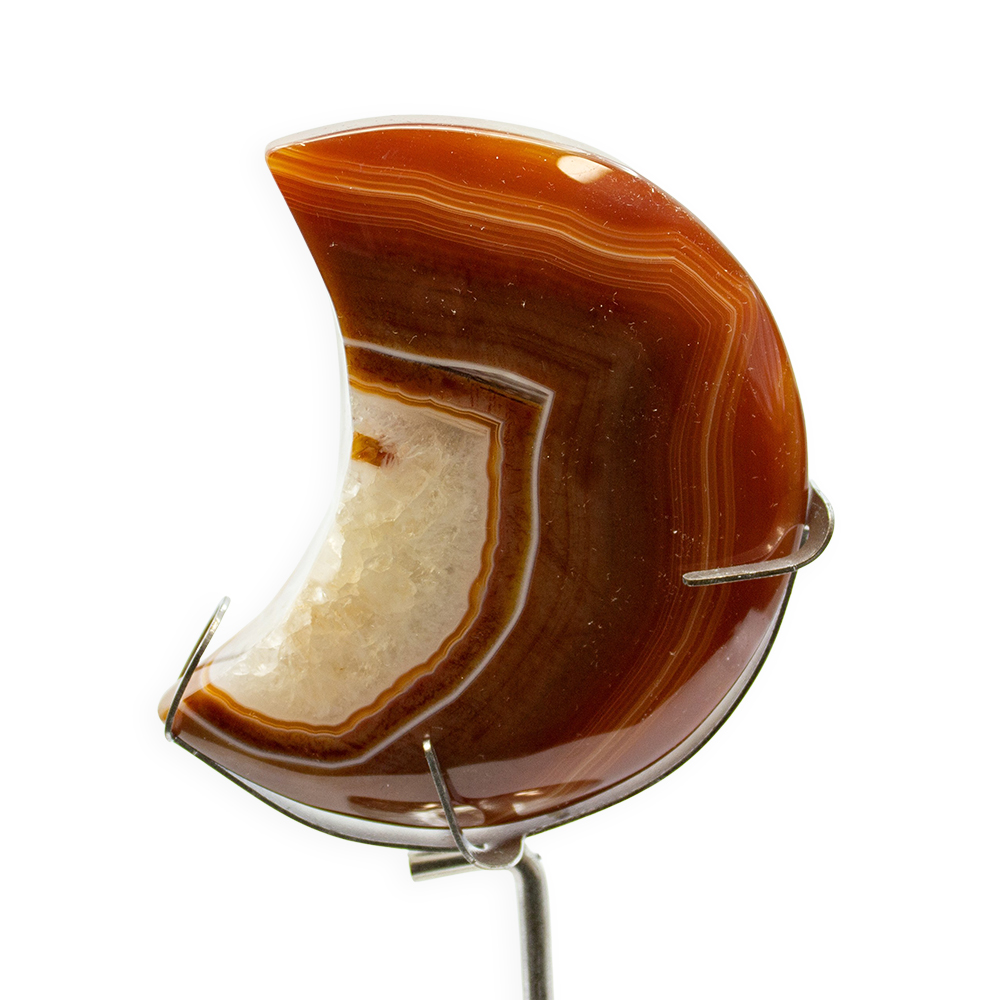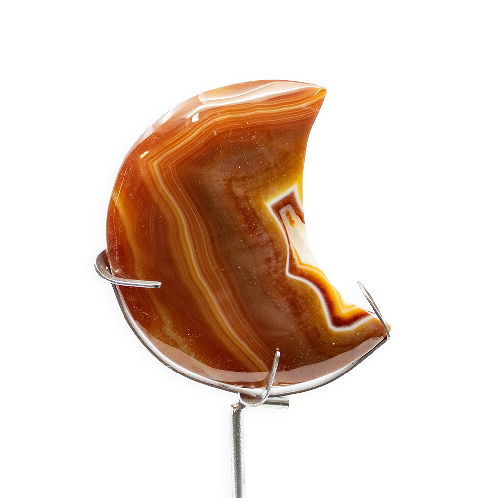 DESCRIPTION: Carnelian Moon with Zodiac Stand. A glassy, translucent stone, Carnelian is an orange-colored variety of Chalcedony, a mineral of the Quartz family. Its color varies from pale pinkish-orange to a deep rusty brown, though it is most known for its brilliant orange and red-orange crystals. Cracks and fractures are natural to the stone.
