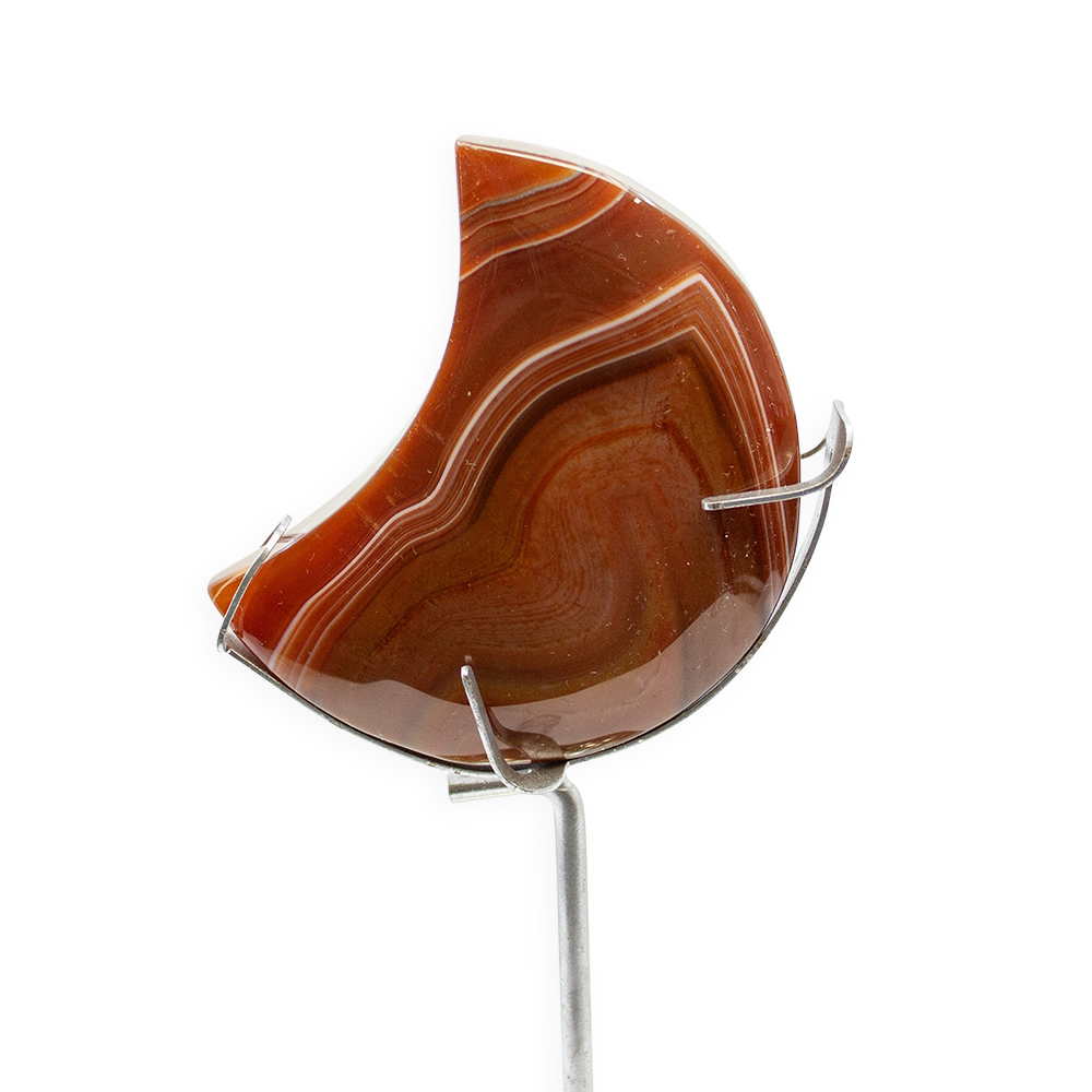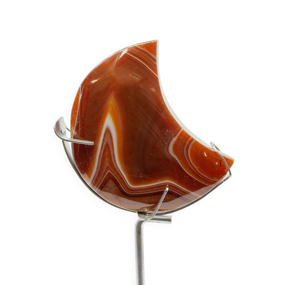 DESCRIPTION: Carnelian Moon with Zodiac Stand. A glassy, translucent stone, Carnelian is an orange-colored variety of Chalcedony, a mineral of the Quartz family. Its color varies from pale pinkish-orange to a deep rusty brown, though it is most known for its brilliant orange and red-orange crystals. Cracks and fractures are natural to the stone.
