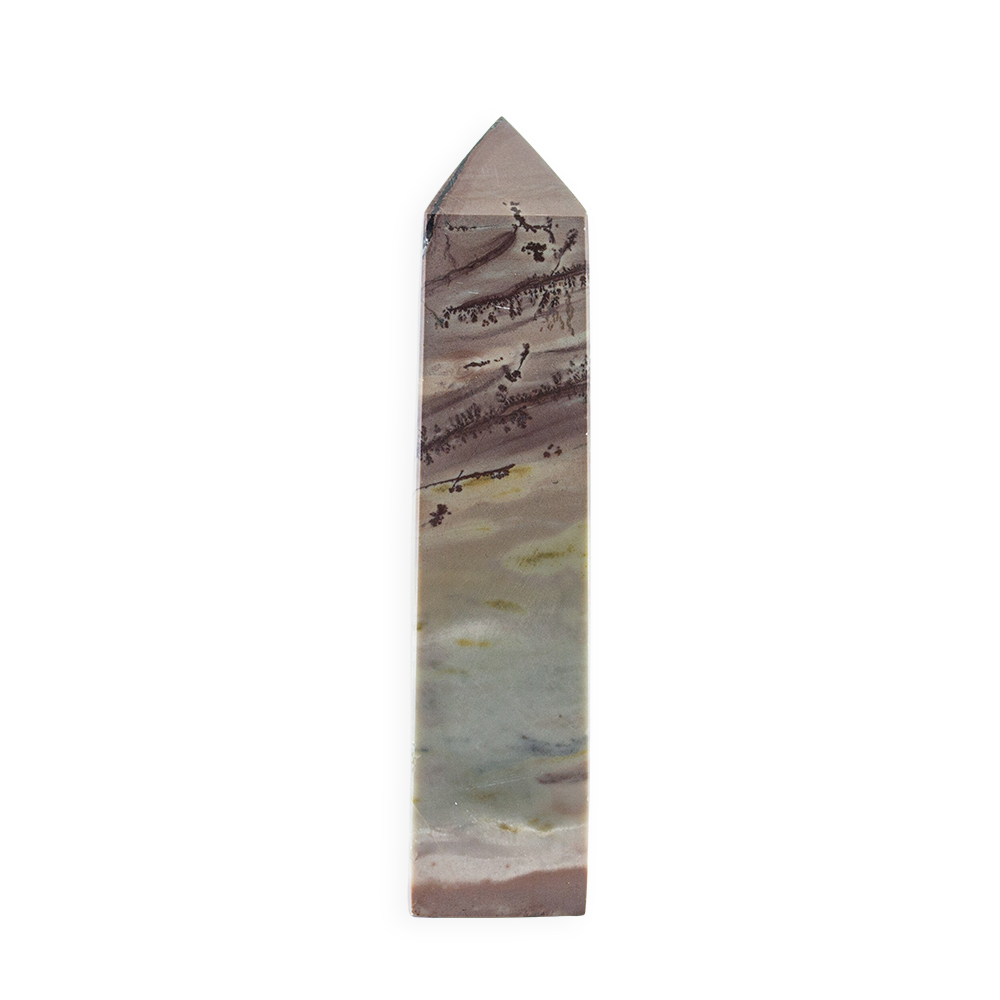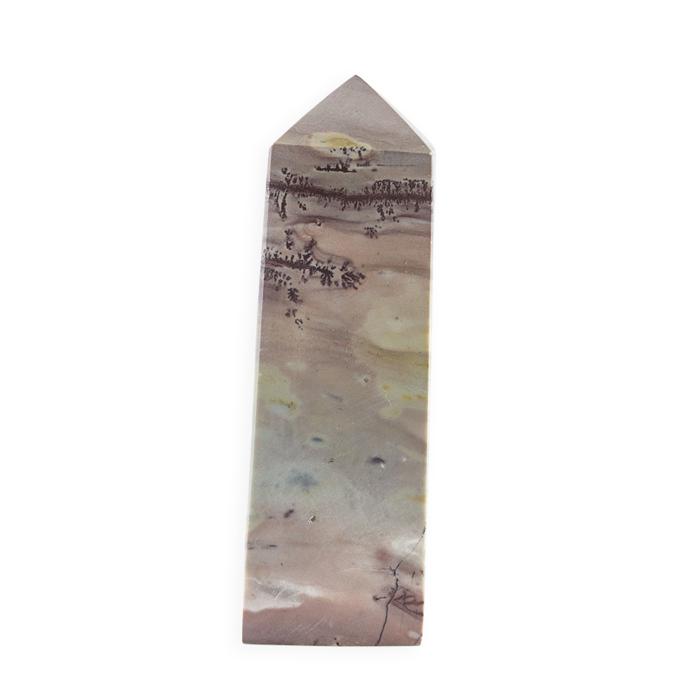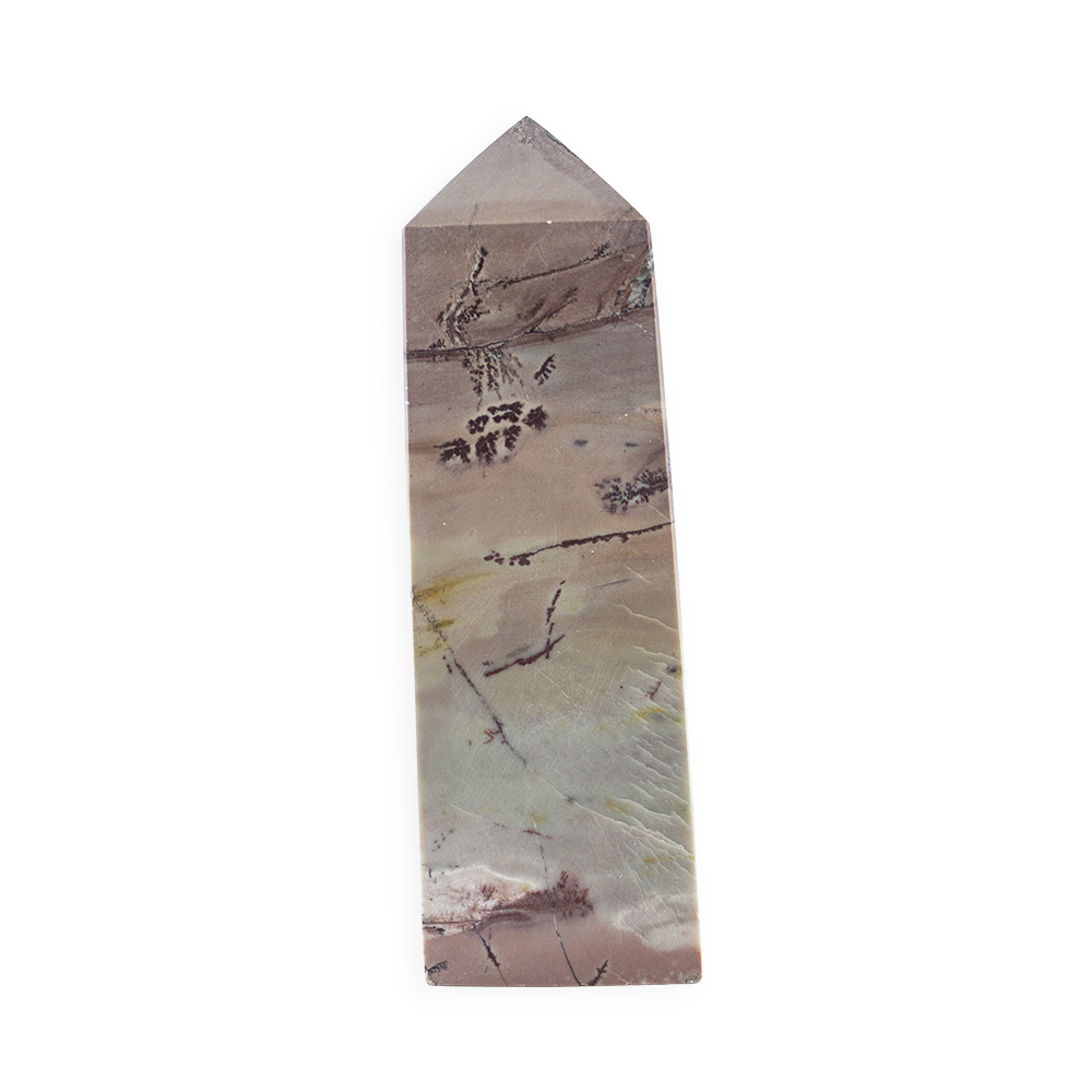 Description: Picture Jasper Tower. Picture Jasper is a type of Jasper, which is an opaque, fine‑grained variety of Quartz. What makes Picture Jasper special is its scenic, landscape‑like patterns that often look like natural scenes, think mountains, rolling hills, desert landscapes, or abstract “paintings” captured in stone. Typical hues include browns, tans, creams, yellows, and greens, created by mineral impurities (like iron oxides).