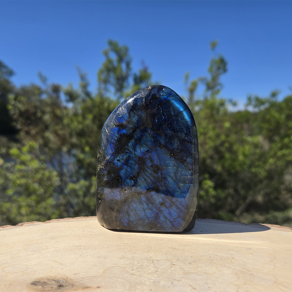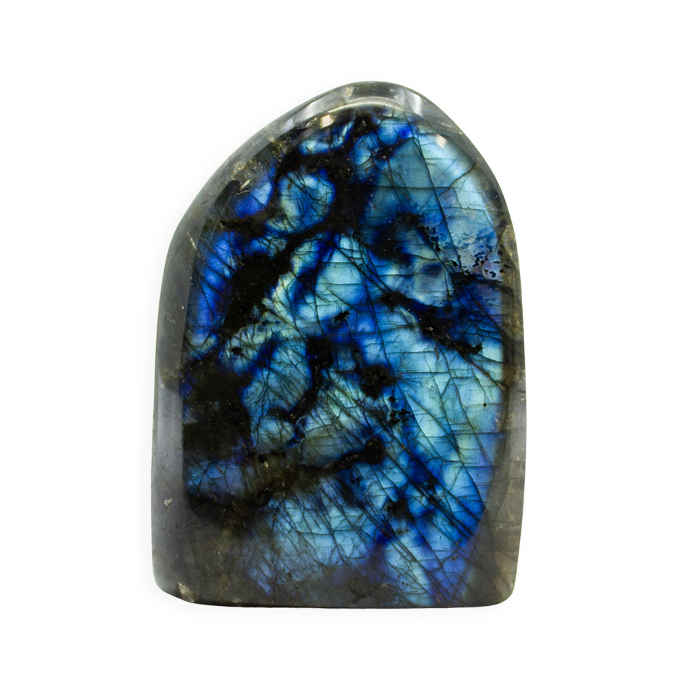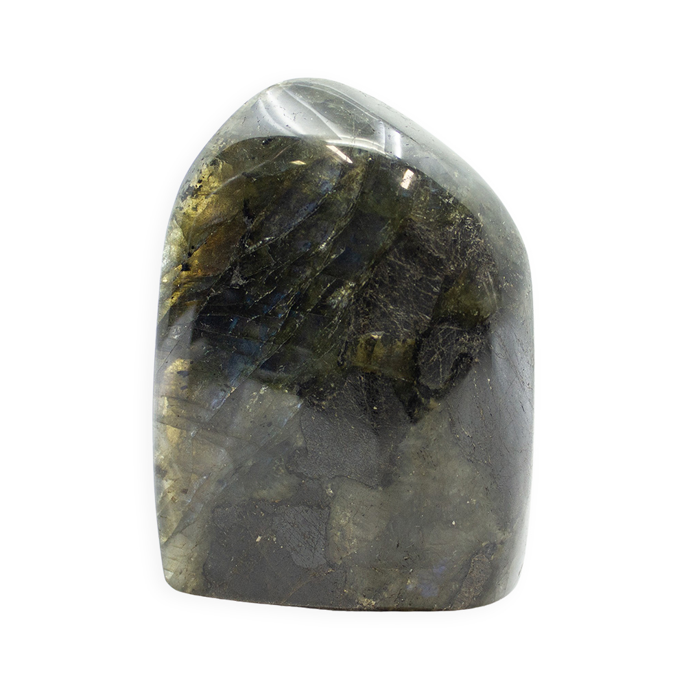 Description: Labradorite Polished Freeform. Labradorite is a member of the Feldspar family and is treasured for its remarkable play of color, known as labradorescence. The stone, usually gray-green, dark gray, black, or grayish-white, is composed of aggregate layers that refract light as iridescent flashes of peacock blue, gold, pale green, or coppery red. The predominant blue varies within the light, displaying hues from deepest blue to various shades of pale, almost blue-green.