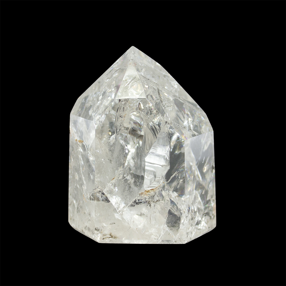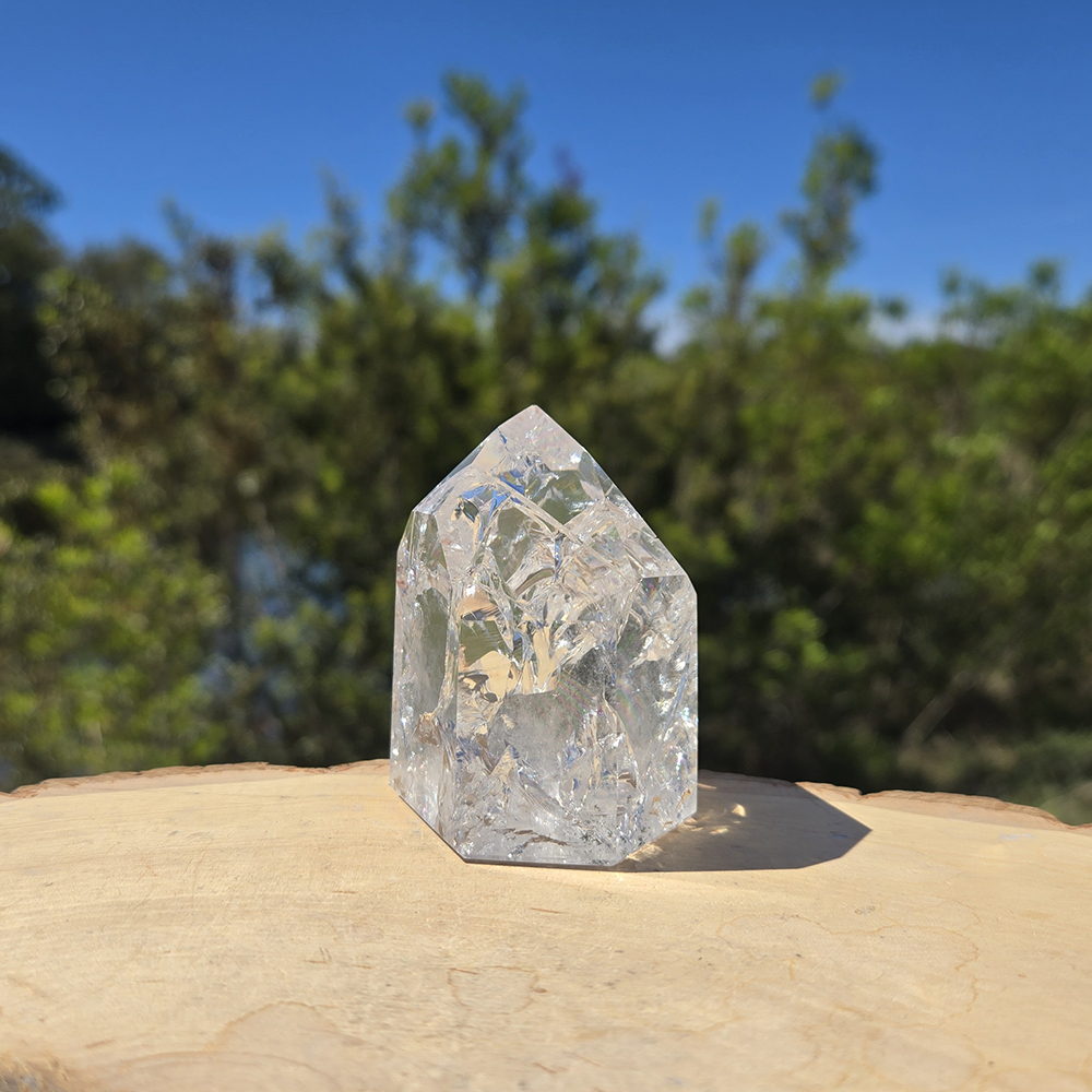 DESCRIPTION: Fire and Ice Isis Quartz Point, also known as Crackle Quartz. These crystals are named due to the process used to “crackle” the quartz. The quartz is heated to very high temperatures and then quickly cooled with cold water, which provides the crackling effect. These crystals have inclusions such as fairy frost and other areas, which provide a resting place for Light Beings.