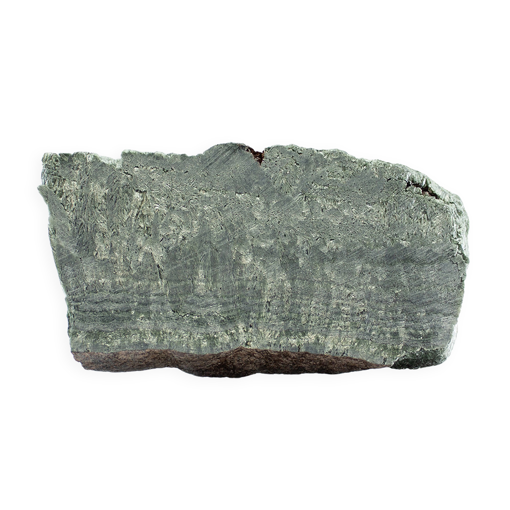 Description: Seraphinite Slab. Seraphinite is a deep green variety of clinochlore, prized for its distinctive silvery, feather-like patterns that resemble angel wings.
