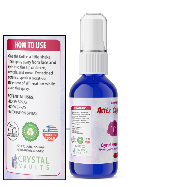 PRIMARY USES:Â This room and body spray can enhance Aries’ efforts to amplify the Universal Life Force to give them courage, wealth, strength, victory, power, and success in new enterprises. If you are an Aries, this crystal energy-infused spray will bring you respect and guard you against being cheated or deceived.