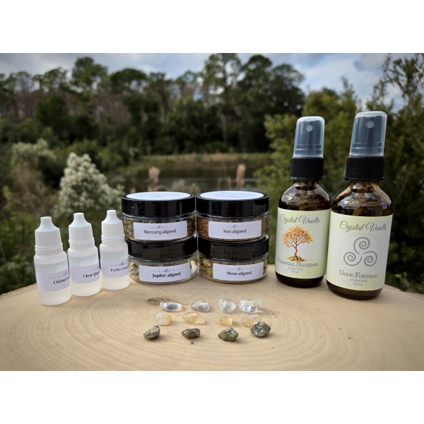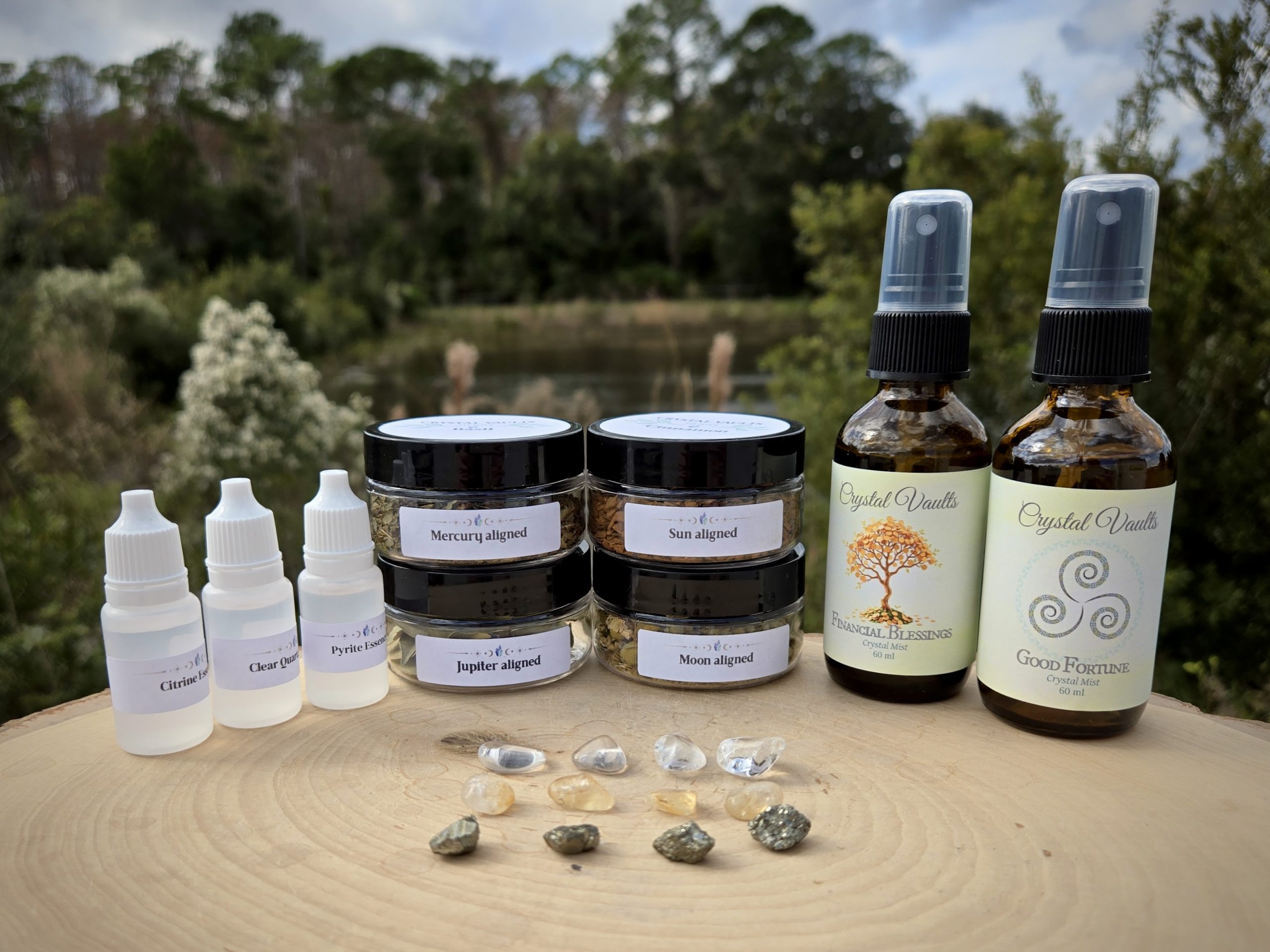 Each kit includes all the specialize materials you’ll need to perform your rituals at home: the crystals, crystal essences, celestial-aligned herbs, and the two Air-element Ritual Mists — Financial Blessing Crystal Mist (Citrine, Sweet Orange & Frankincense) and Good Fortune Crystal Mist (Aventurine, Vetiver & Lemon Balm). Each item has been carefully created to carry the true energetic signatures of prosperity and renewal.