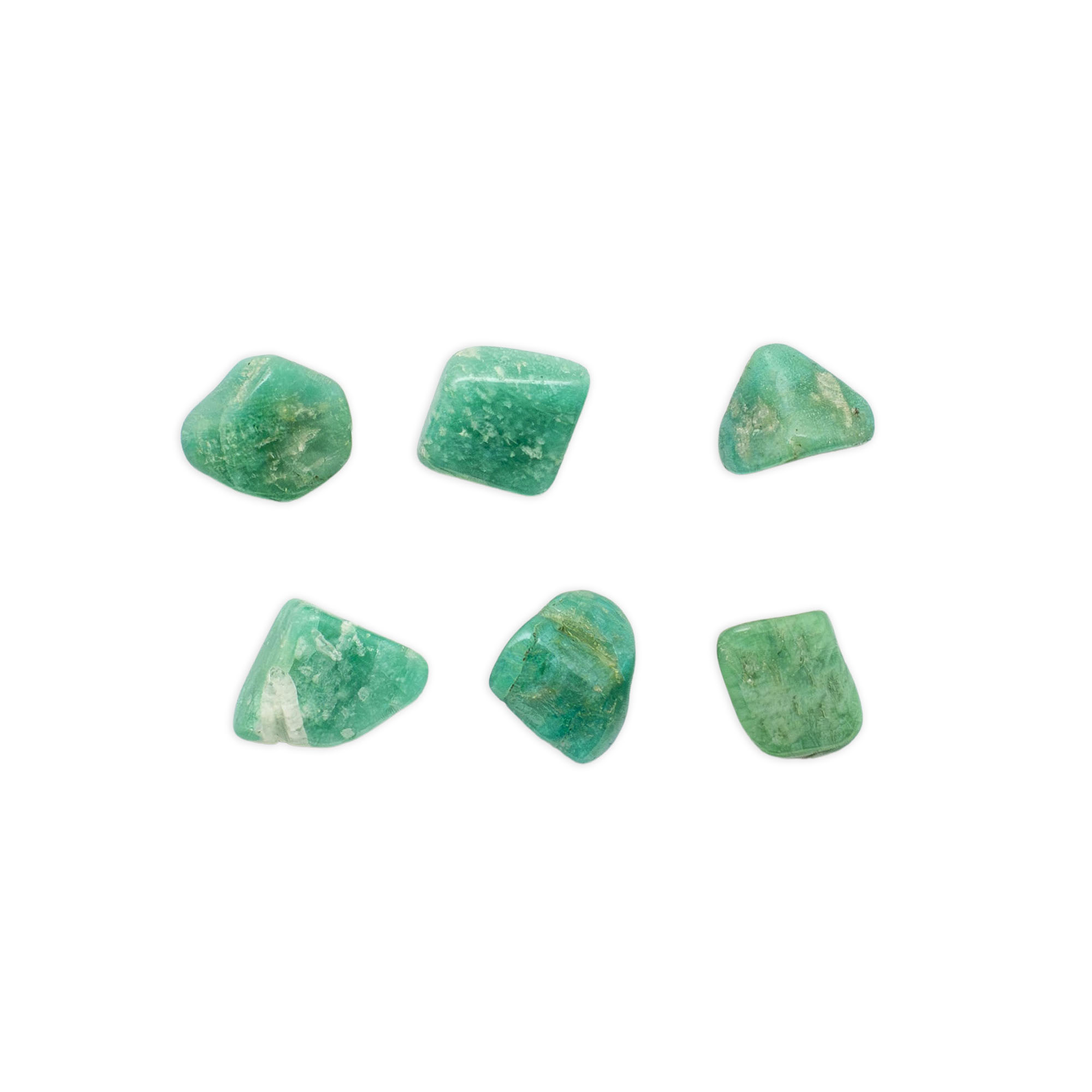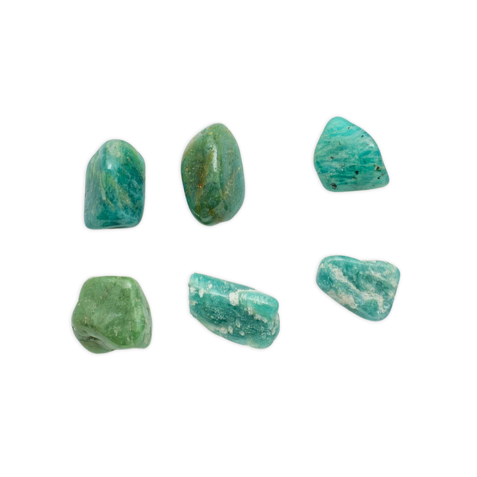 Description: Amazonite Tumbled Set. Amazonite, also called Amazon Jade or Amazon Stone, is a green to blue-green variety of Microcline, a Feldspar mineral that forms in short prismatic, tabular crystals or masses. It ranges in hue from bright verdigris green to paler shades of turquoise, sometimes with white, yellow, or grey portions, and can be translucent to opaque. It has a vitreous luster and, when polished, resembles finely cracked or spider-webbed marble and displays a Schiller effect of pearly iridescence throughout the stone.