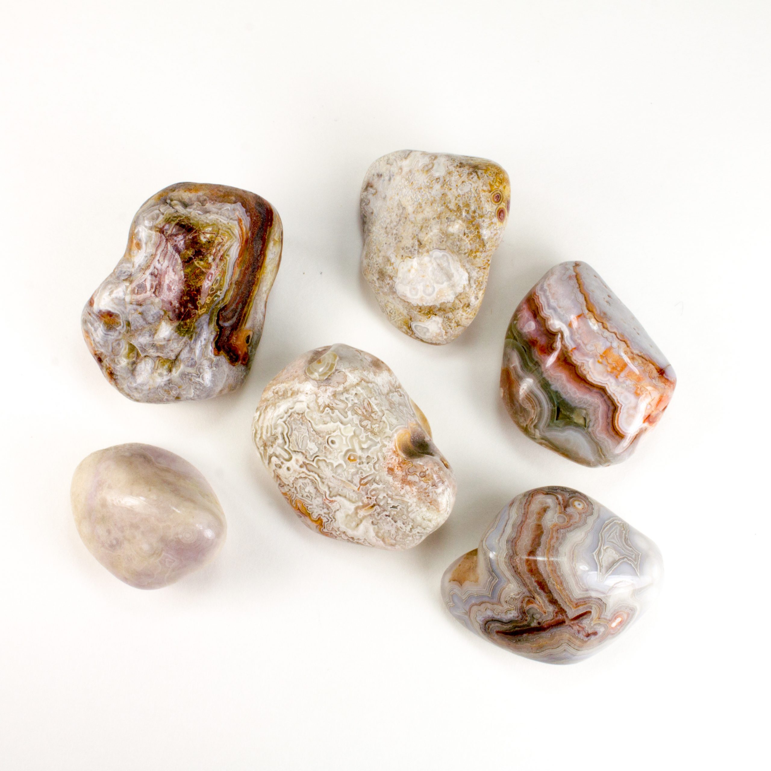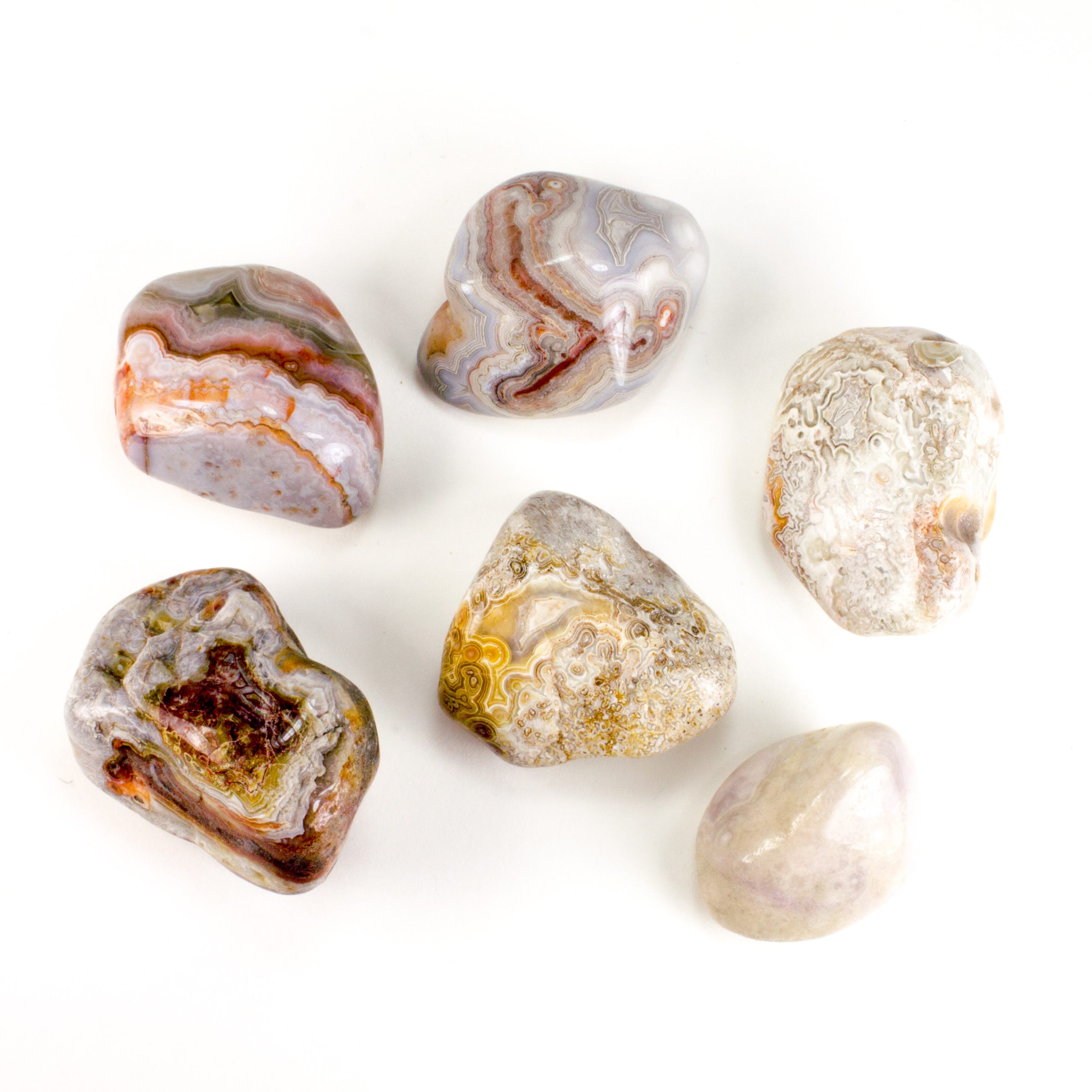 Description This is beautiful Crazy Lace Agate Tumbled Set. It brings a great mixture of violet and cream tones to a well cut and polished agate. Crazy Lace Agate is a popular agate that takes a high polish. You will receive the typical item shown.