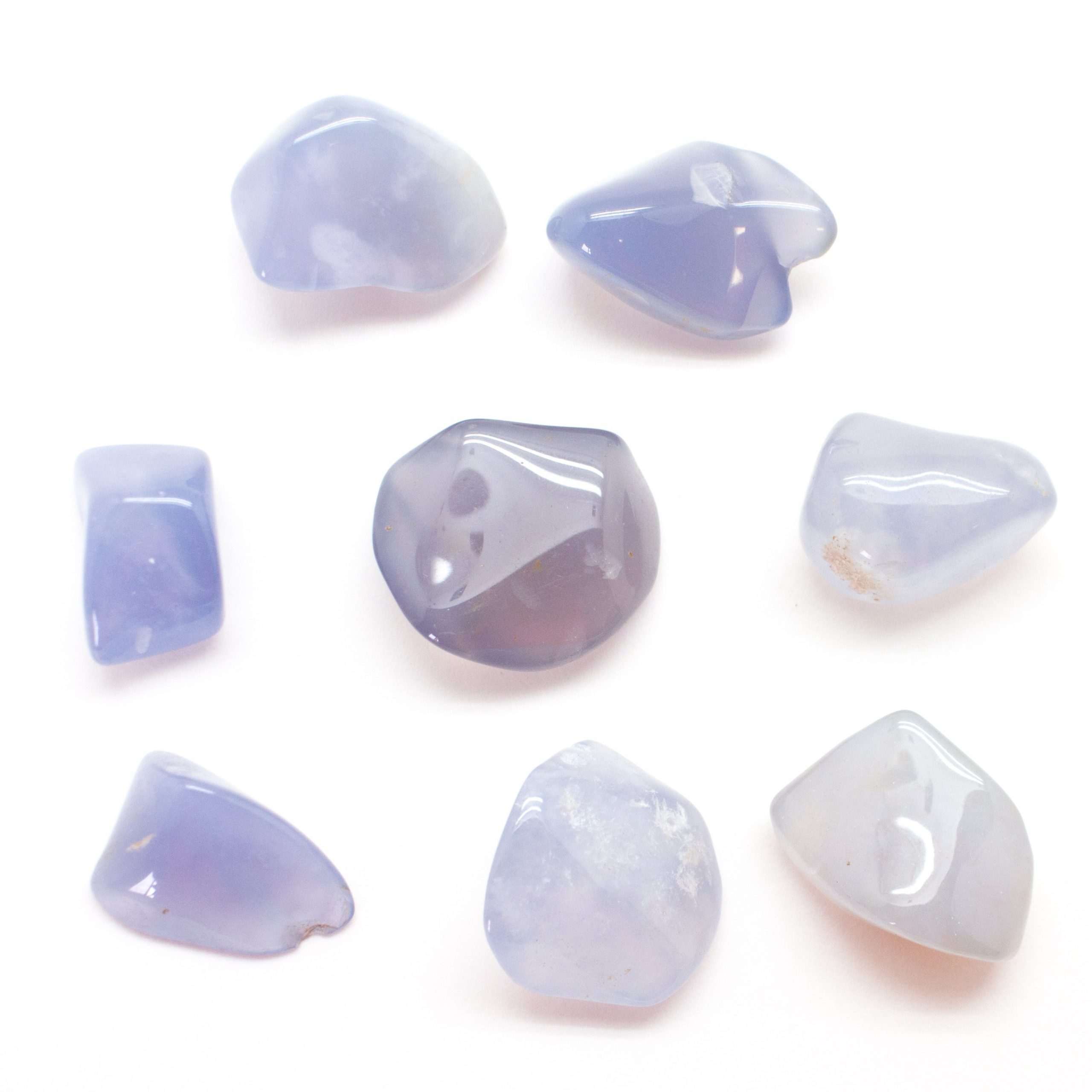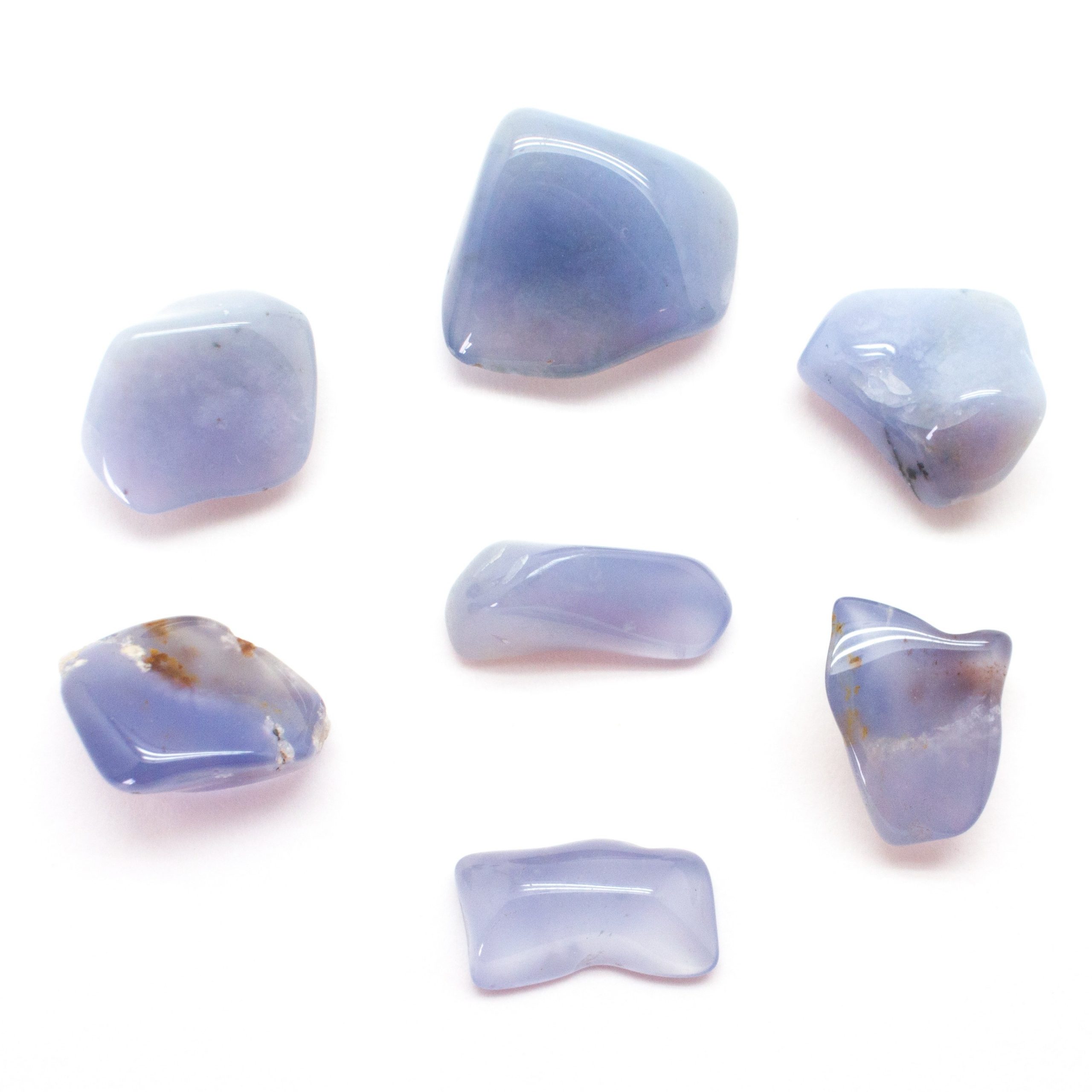 Description: This is a highly polished Blue Chalcedony Tumbled Stone Set. The color is a typical light blue. Read more about the energies of Blue Chalcedony in our Crystal Metaphysical Encyclopedia entry for Blue Chalcendony.